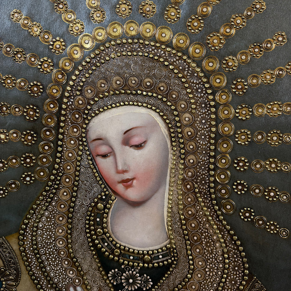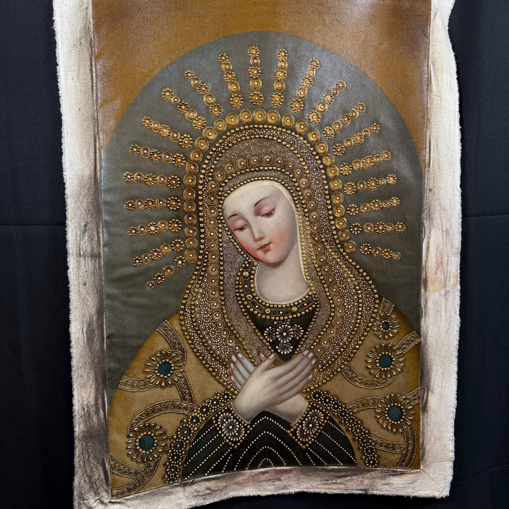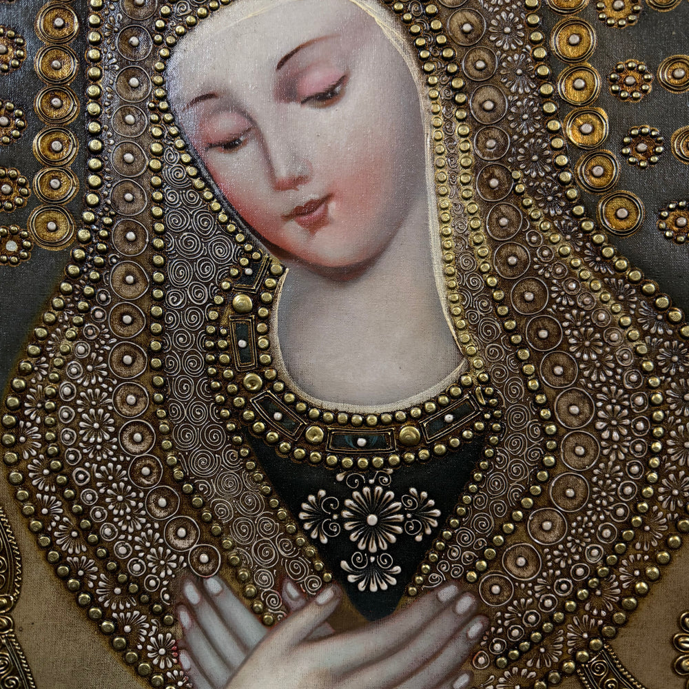 A beautiful rendition of Mary, the Mother of God, with her arms over her Immaculate Heart, manifesting her infinite sorrow. Our Lady of Sorrows, pray for us!
