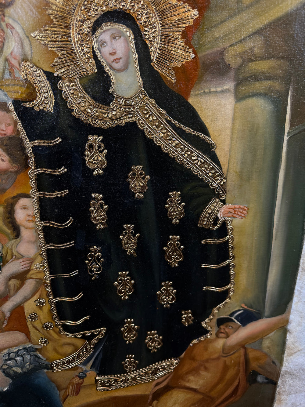 The warm earth tones, gold accents, and expressive faces reflect the characteristic spirituality of South American sacred art, making this an exceptional piece for collectors, chapels, and devout homes.