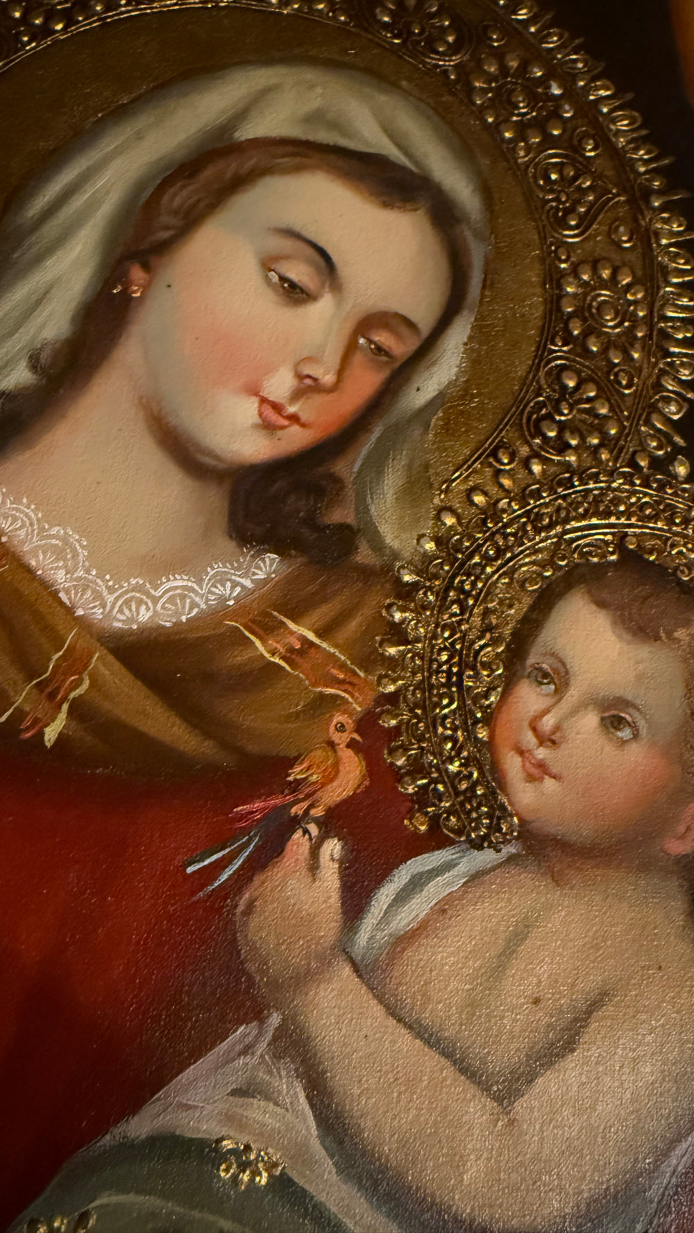 This devotional artwork portrays the Blessed Virgin Mary lovingly holding the Child Jesus. The Peruvian artist has painted rich Andean-Baroque gold detailing, deep Marian reds and blues, and expressive faces that radiate maternal love and divine serenity. The elongated silhouettes, ornate halos, and fine floral accents reflect the unmistakable Cusco School tradition—timeless, reverent, and full of spiritual symbolism.