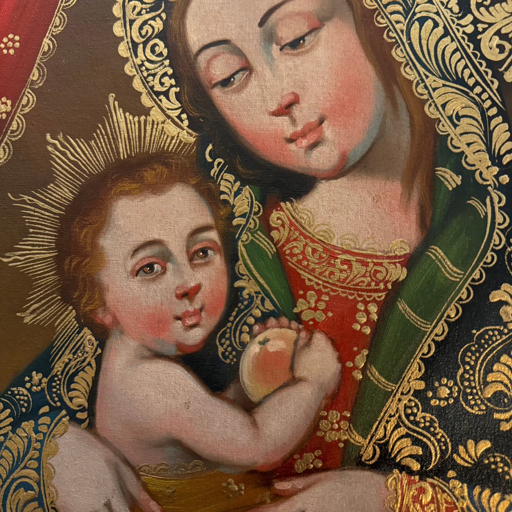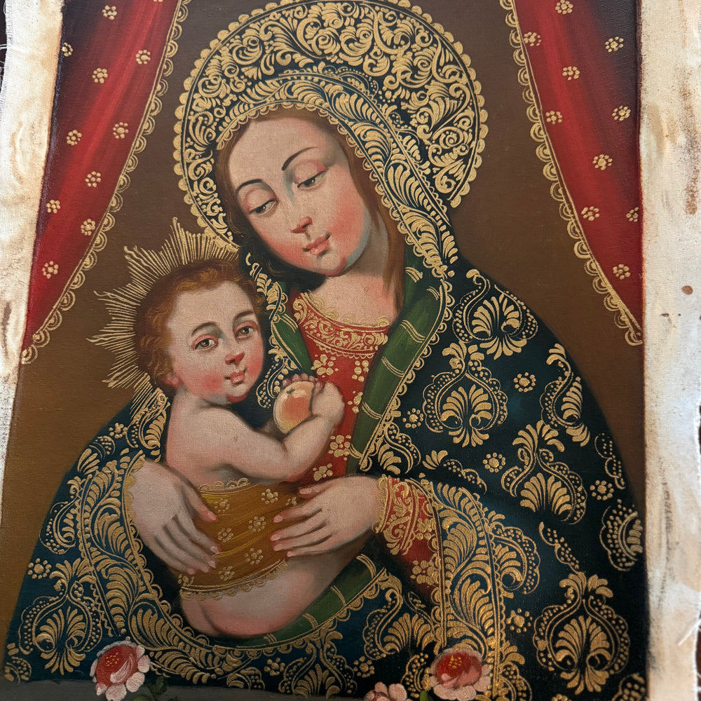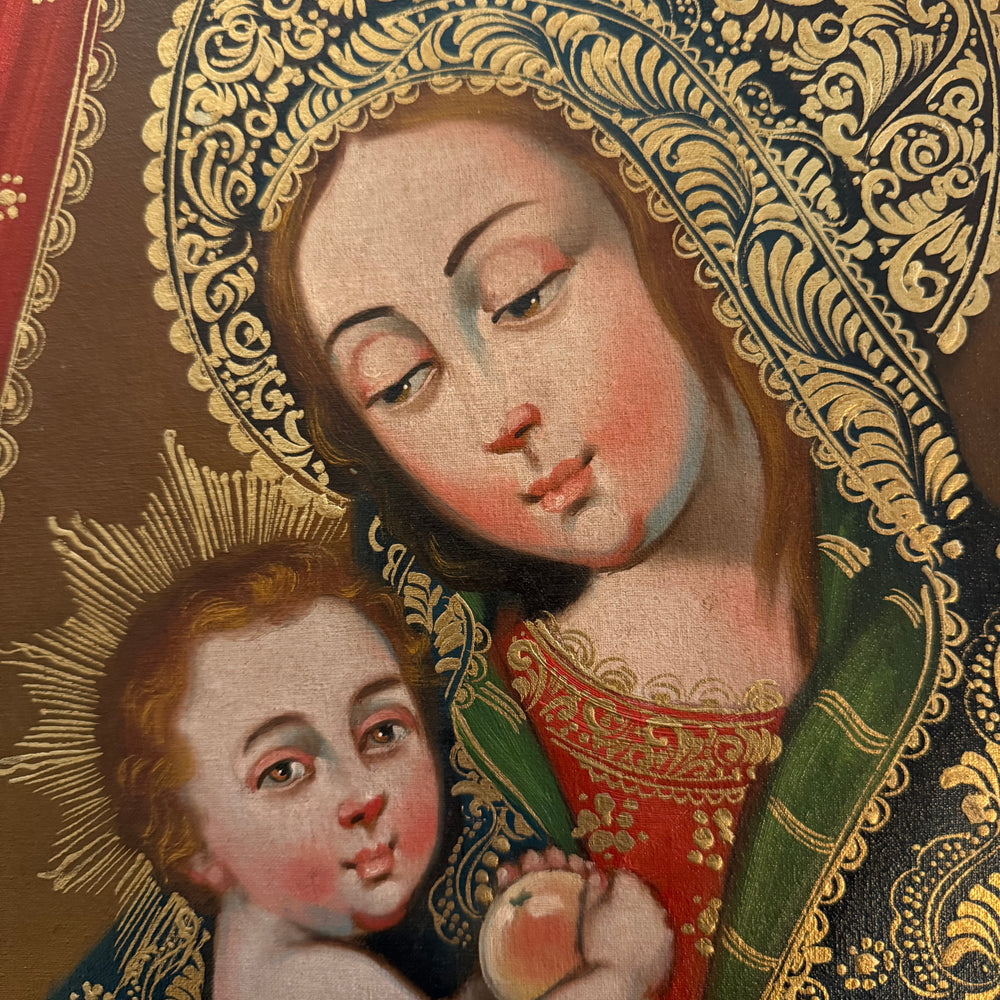 This beautiful composition portrays the Virgin Mary cradling the infant Jesus with deep maternal affection. Her serene expression, ornate mantle, and radiant golden halo highlight her role as the Mother of God and Queen of Heaven, while the Christ Child looks upward with innocence and divine trust. Rich textures, gold-leaf detailing, and warm Andean-Baroque tones give this piece a timeless spiritual beauty.