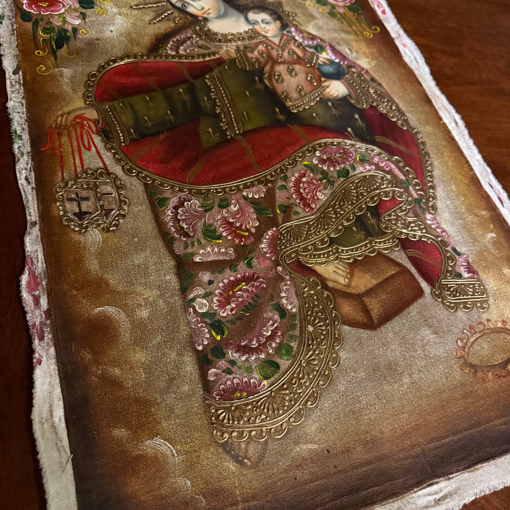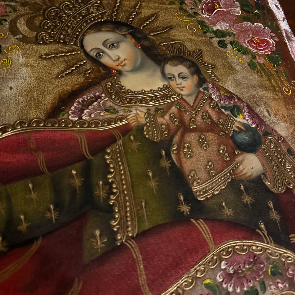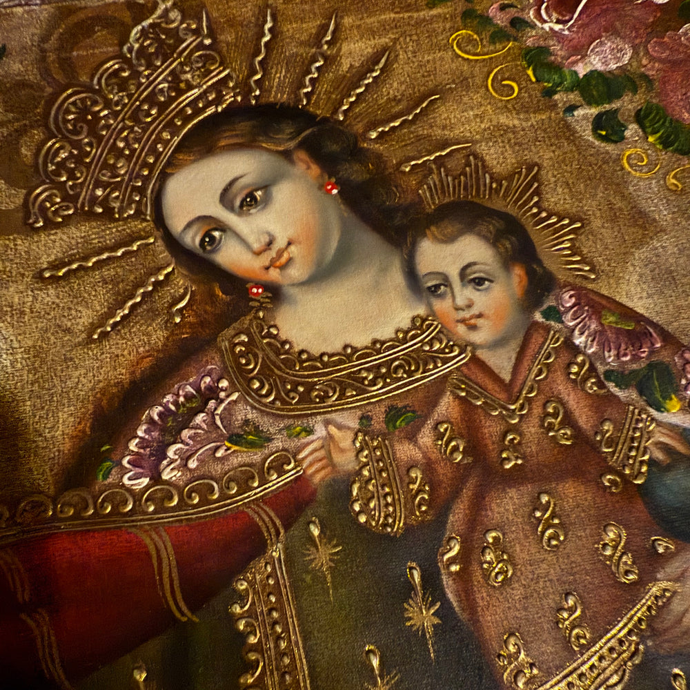 Experience the tenderness and sacred beauty of the Madonna and Child through this 16×24-inch original hand-painted oil painting, created in the iconic Cusco School (Peruvian Andean-Baroque) tradition.