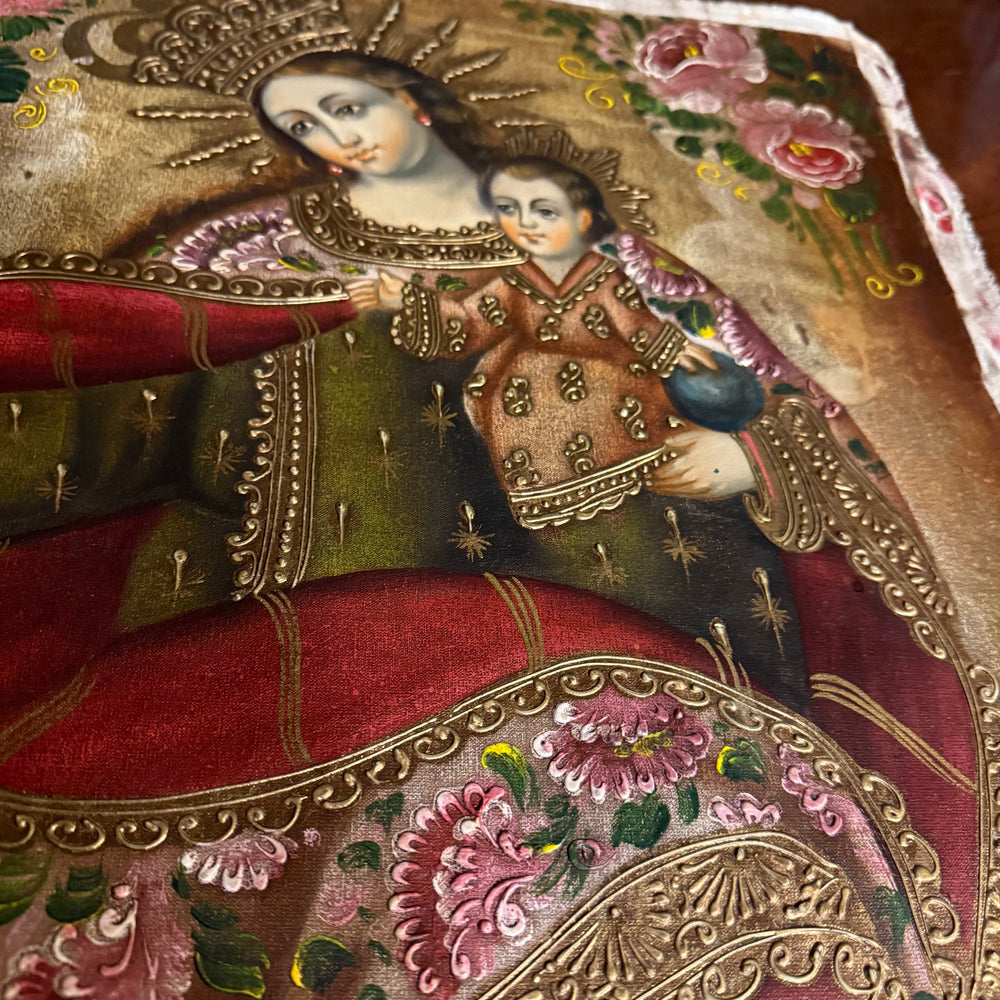 This exquisite artwork portrays the Blessed Virgin Mary lovingly holding the Child Jesus, both adorned in richly embroidered garments and radiant gold-leaf accents. The Peruvian artist’s intricate detailing—seen in the flowing robes, shimmering patterns, and serene expressions—captures the warmth, purity, and divine intimacy of this holy moment.
