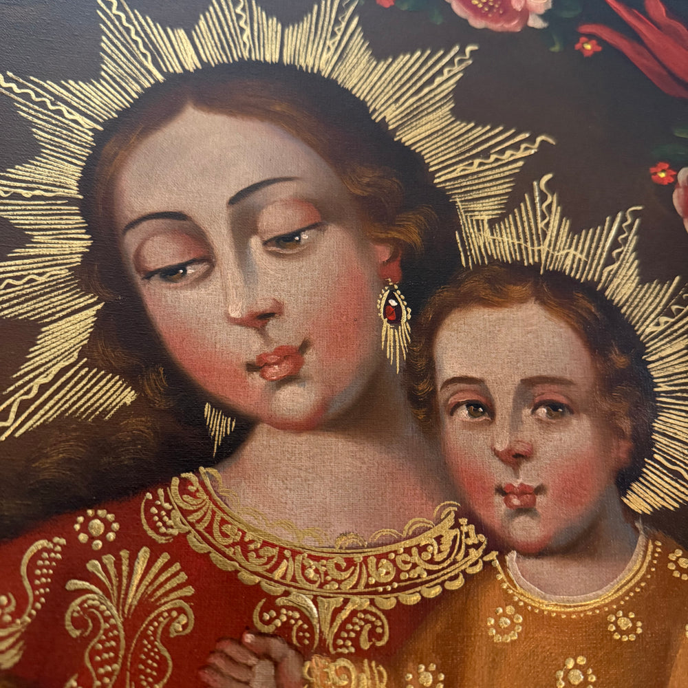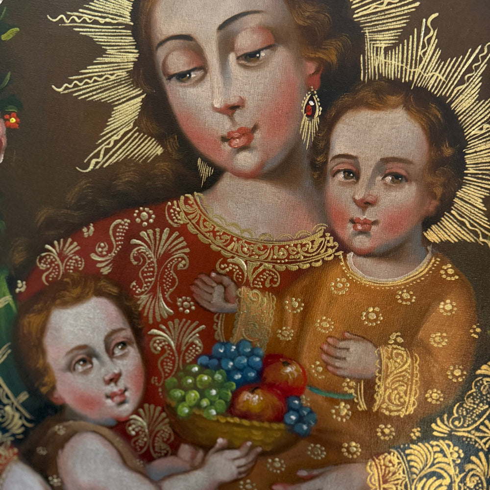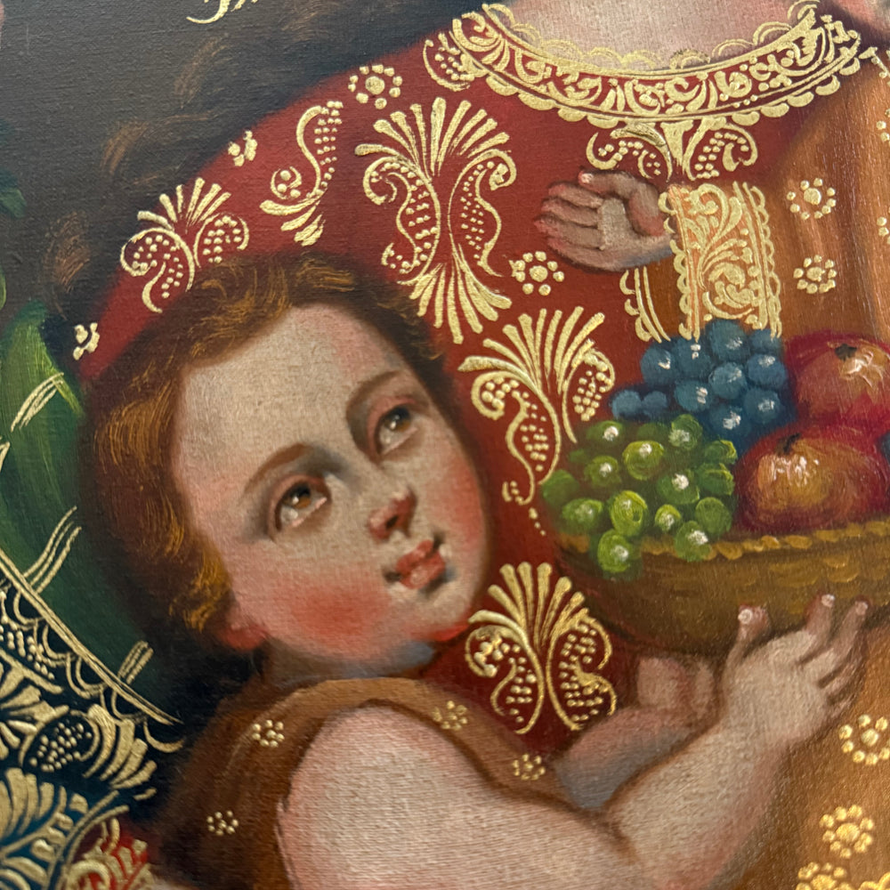 This composition depicts Mary lovingly holding the Christ Child, while little John the Baptist leans near them—symbolizing the prophetic bond and holy friendship between the two cousins. The artist’s rich colors, gold-leaf accents, and Andean-Baroque details create a captivating and devotional presence that brings peace and joy to any sacred space.