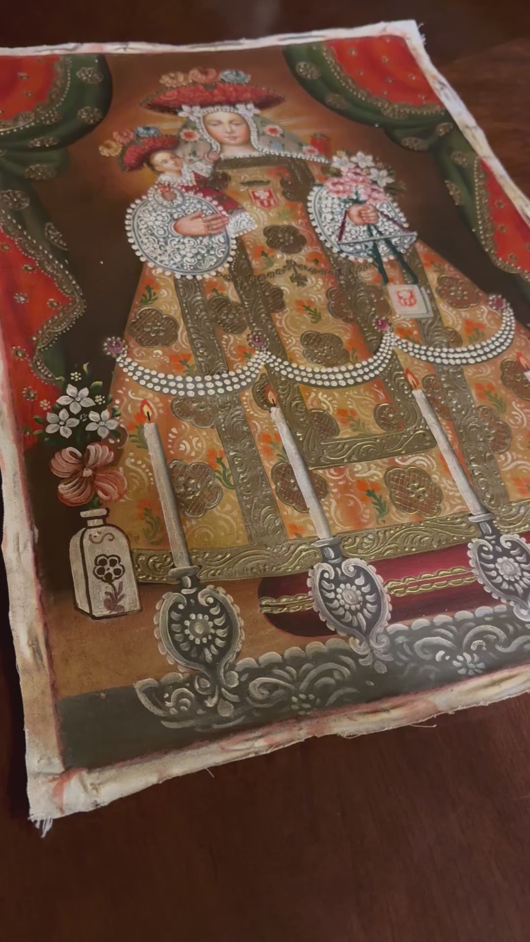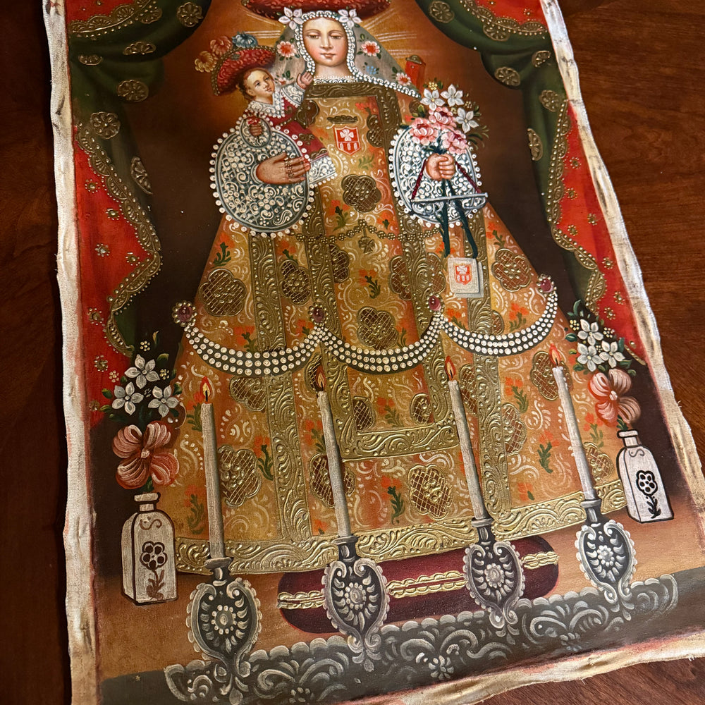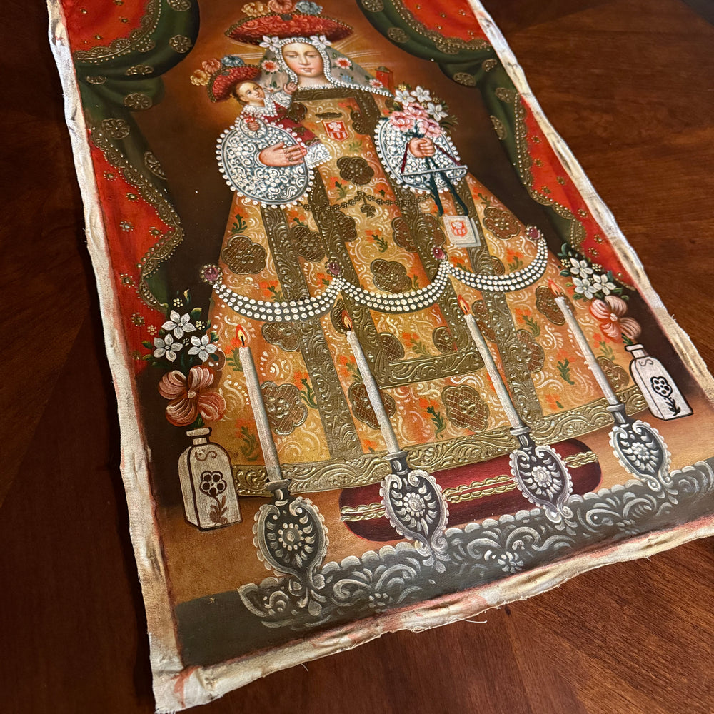 Honor the tender love and serene majesty of the Blessed Virgin with this 16×24-inch original hand-painted oil painting of Our Lady of Bethlehem, created in the richly adorned Cusco School (Peruvian sacred art) tradition.