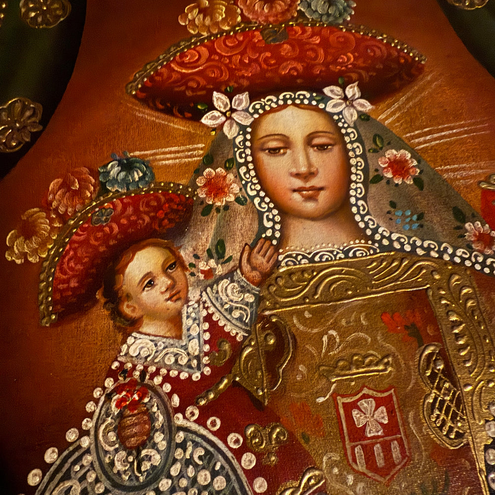 This stunning depiction presents Mary enthroned as Queen and Mother, adorned in an elaborate gold-embroidered mantle characteristic of Andean-Baroque devotion. Her dress, symbols, and posture reflect the historic Marian veneration of the “Virgen de Belén,” a title deeply rooted in colonial Peru and celebrated for her maternal protection over families and communities.