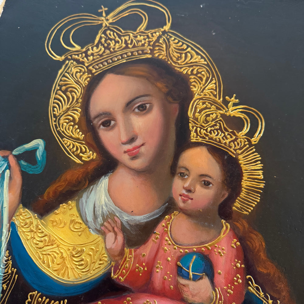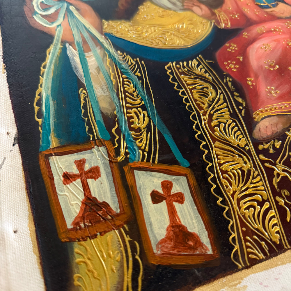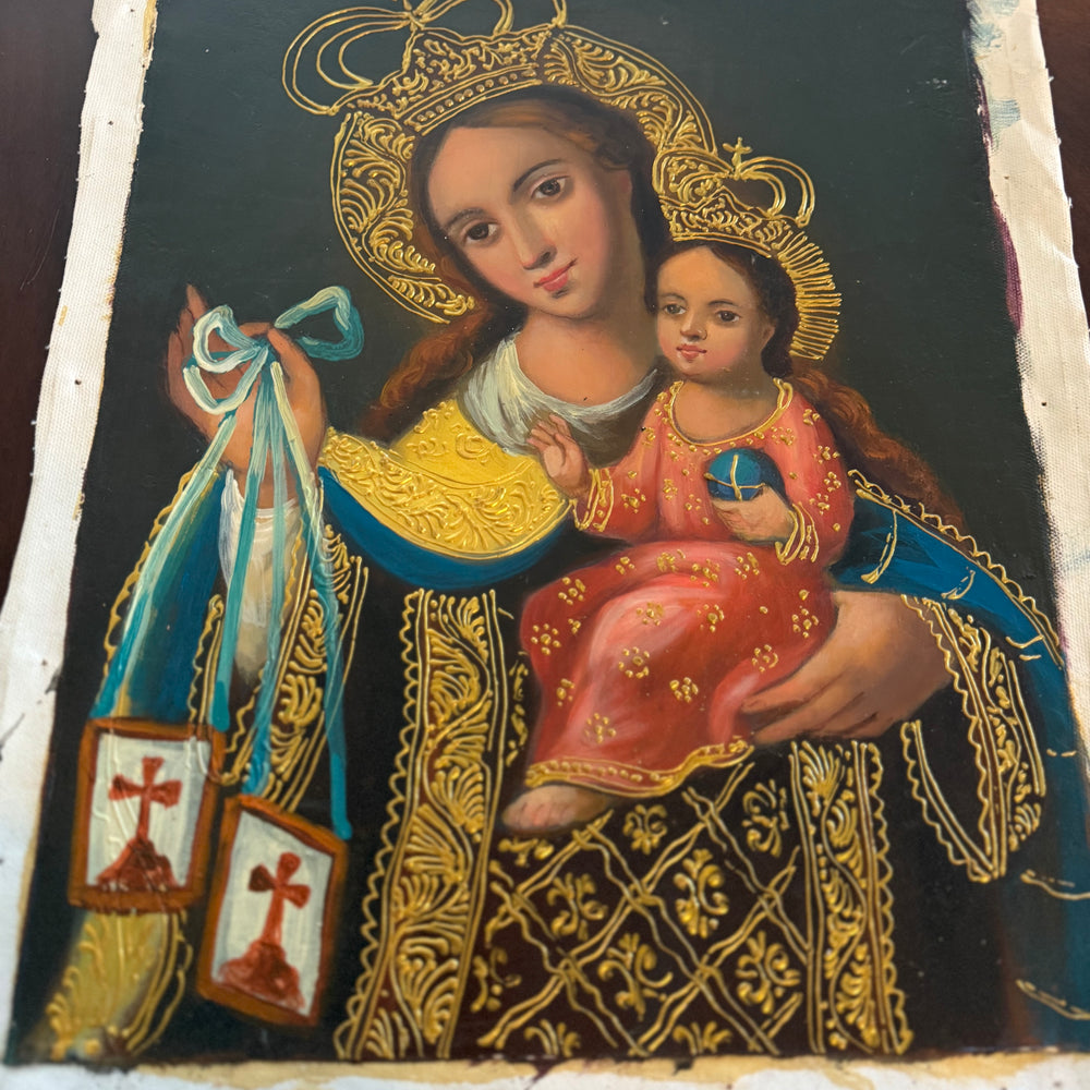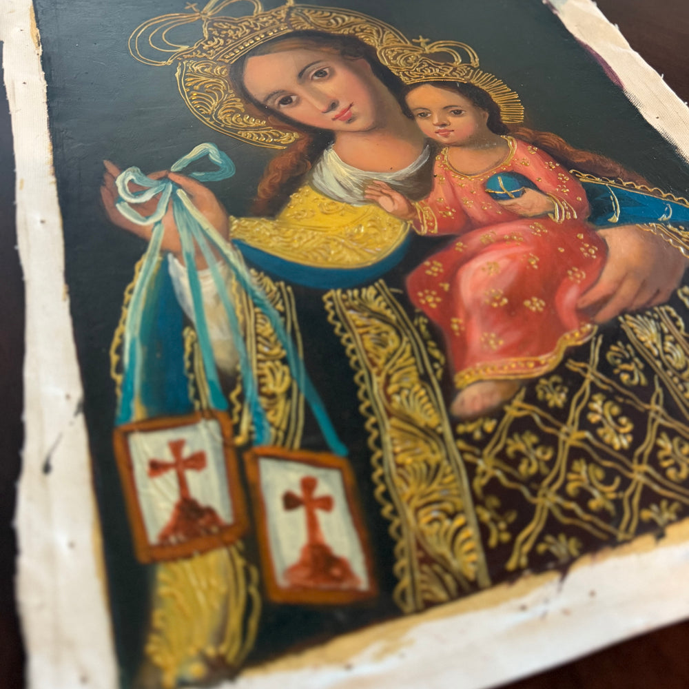 This reverent composition portrays the Blessed Virgin Mary holding the Child Jesus, both presenting the Brown Scapular—an enduring sign of grace, heavenly assistance, and the promise of Mary’s protection. Rich gold accents, Andean-Baroque detailing, and warm, luminous colors give this piece a sacred beauty that elevates any prayer corner, home altar, or devotional space.