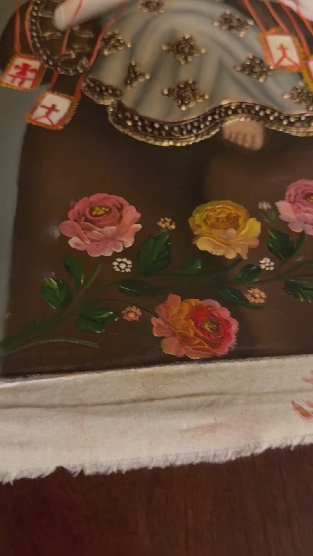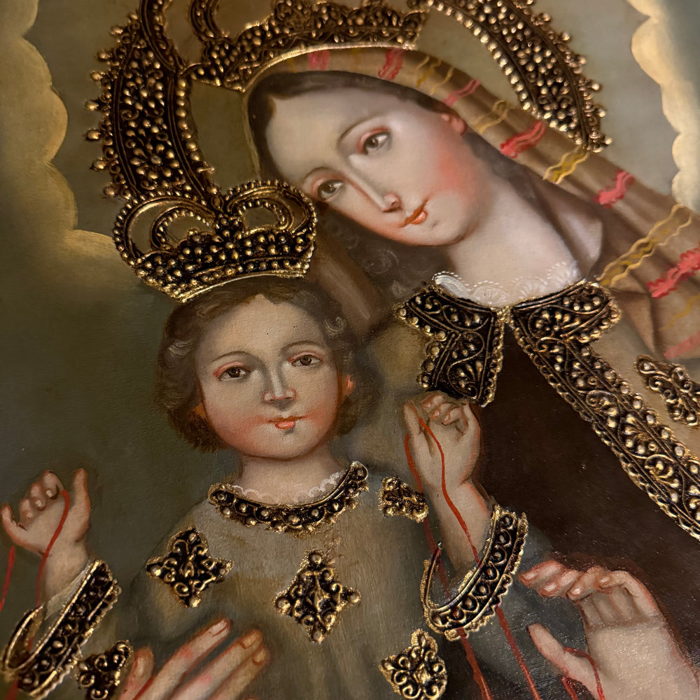 This beautiful artwork portrays the Blessed Virgin Mary holding the Child Jesus with tender strength, both adorned in richly detailed garments and surrounded by warm, radiant colors. The Peruvian artist’s craftsmanship shines in the intricate gold leaf designs, expressive faces, and floral accents—hallmarks of Cusco School sacred art.