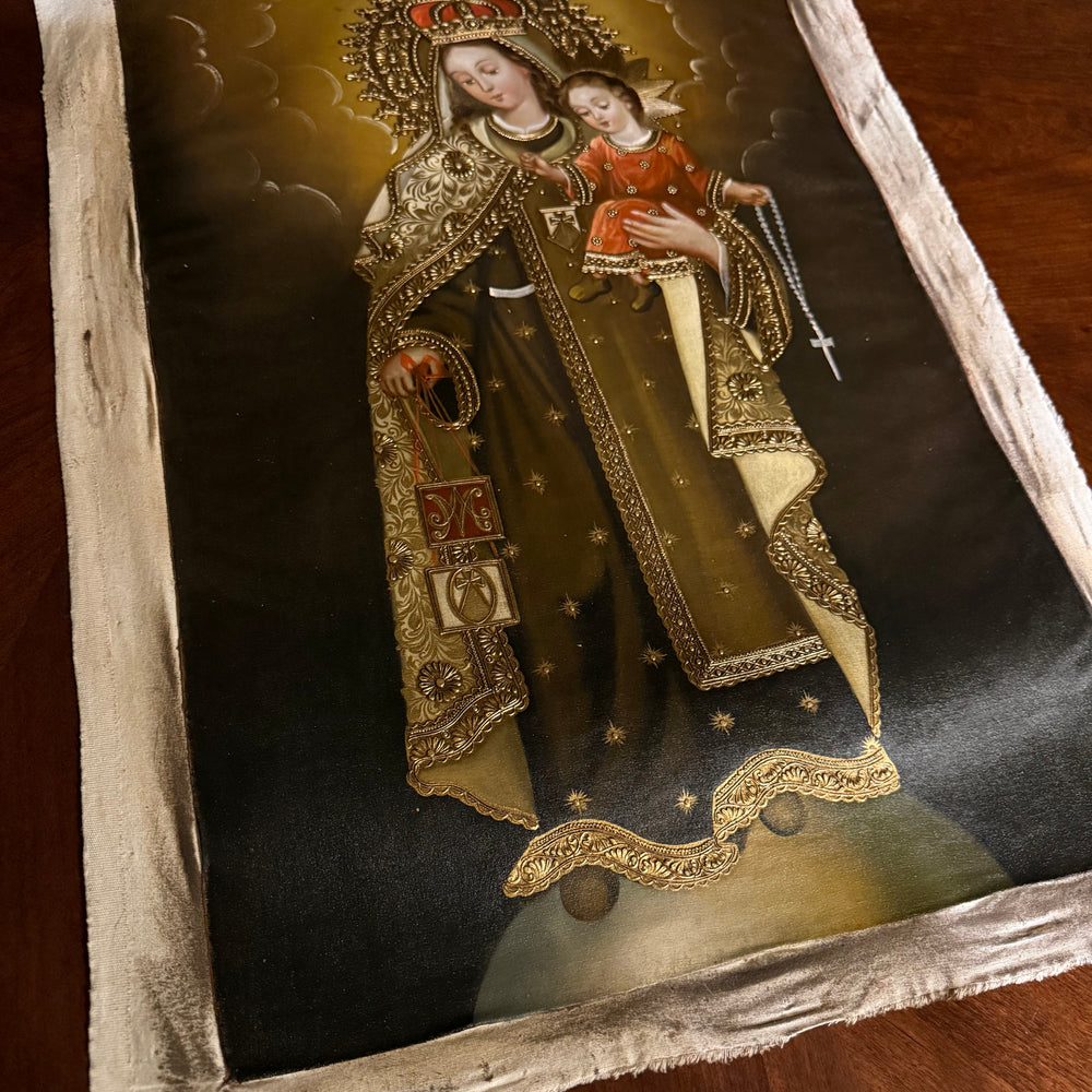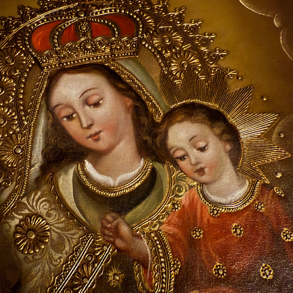 Honor the powerful intercession of Our Lady of Mount Carmel with this 16×24-inch original hand-painted oil painting, crafted in the traditional Cusco School (Peruvian Andean-Baroque) style.