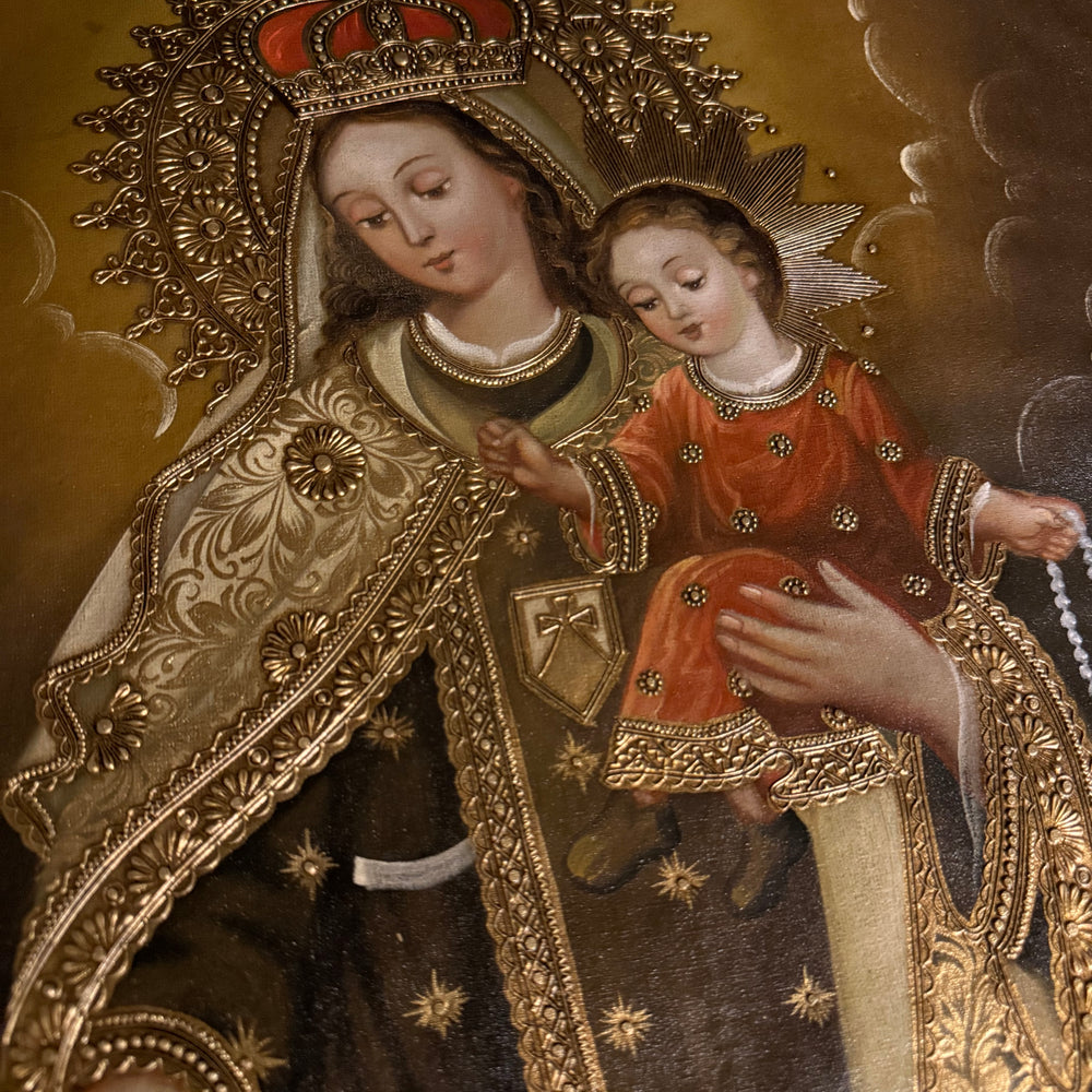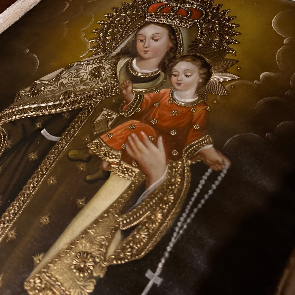 This striking artwork depicts the Blessed Virgin Mary clothed in richly embroidered garments, holding the Child Jesus close while presenting the sacred Brown Scapular, the symbol of her maternal protection and promise of salvation. The Peruvian artist’s craftsmanship is evident in the ornate gold detailing, expressive faces, and vibrant colors that reflect the depth of Marian devotion.