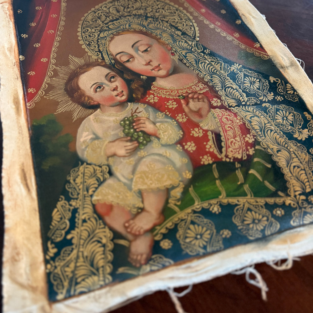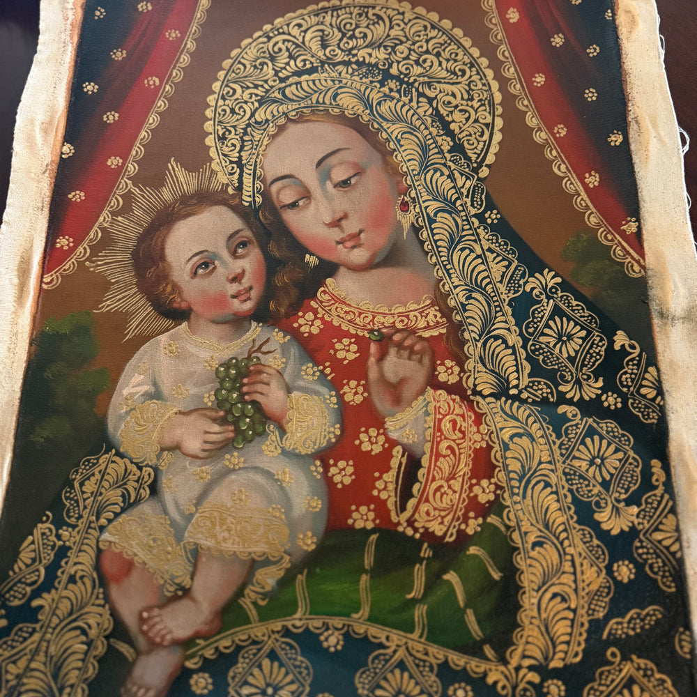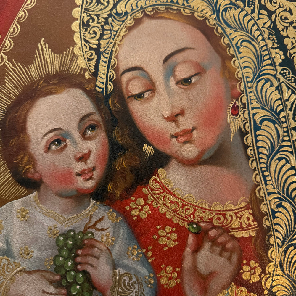 Rich gold detailing, expressive faces, and warm Andean-Baroque colors give this piece a striking devotional presence. The intimate interaction between Mother and Child makes this painting especially suited for reflection on the Incarnation, the Eucharist, and the maternal love of Mary.