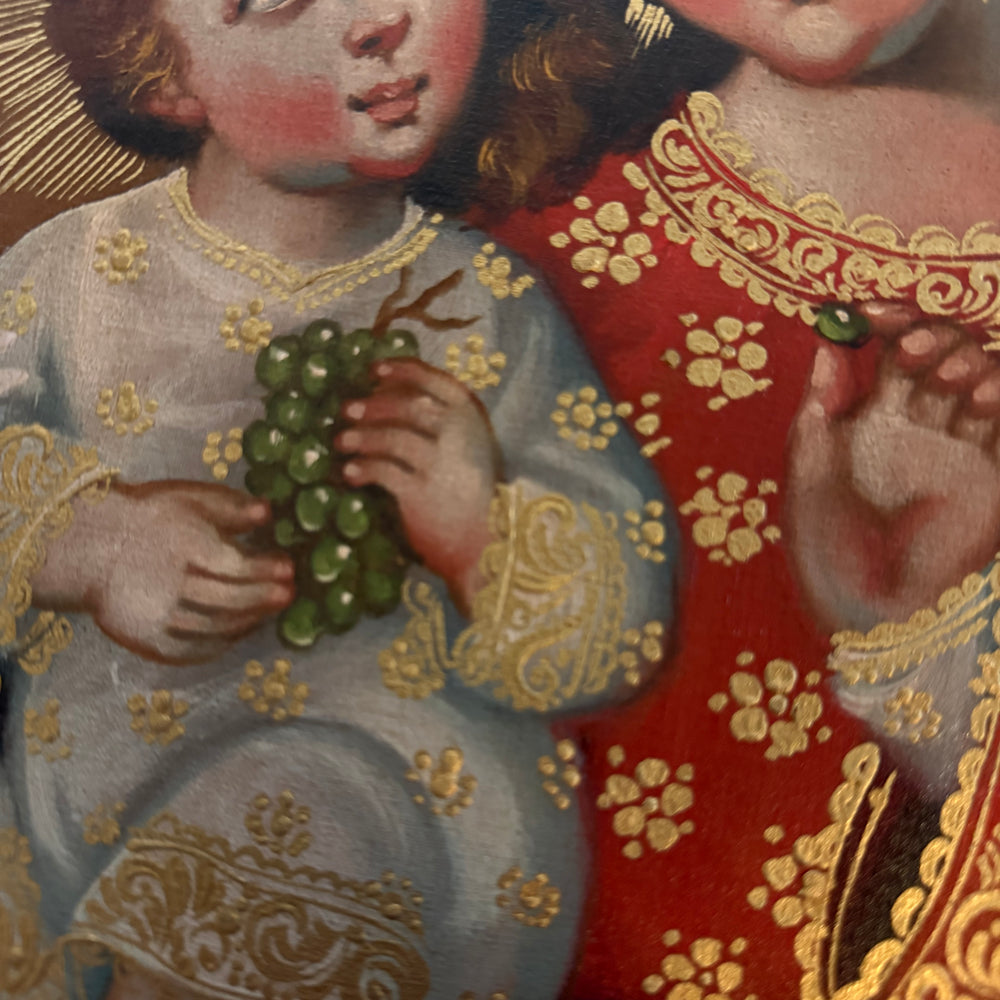 This captivating composition portrays the Blessed Virgin Mary holding the Child Jesus, who lovingly presents a cluster of grapes. In sacred art, grapes represent the Precious Blood of Christ, the Holy Eucharist, and Christ as the True Vine—reminding us that salvation, spiritual nourishment, and everlasting life come from Him alone. Mary, as the Mother of the Eucharist, gently directs our hearts toward her Son and the mystery of His sacrifice.