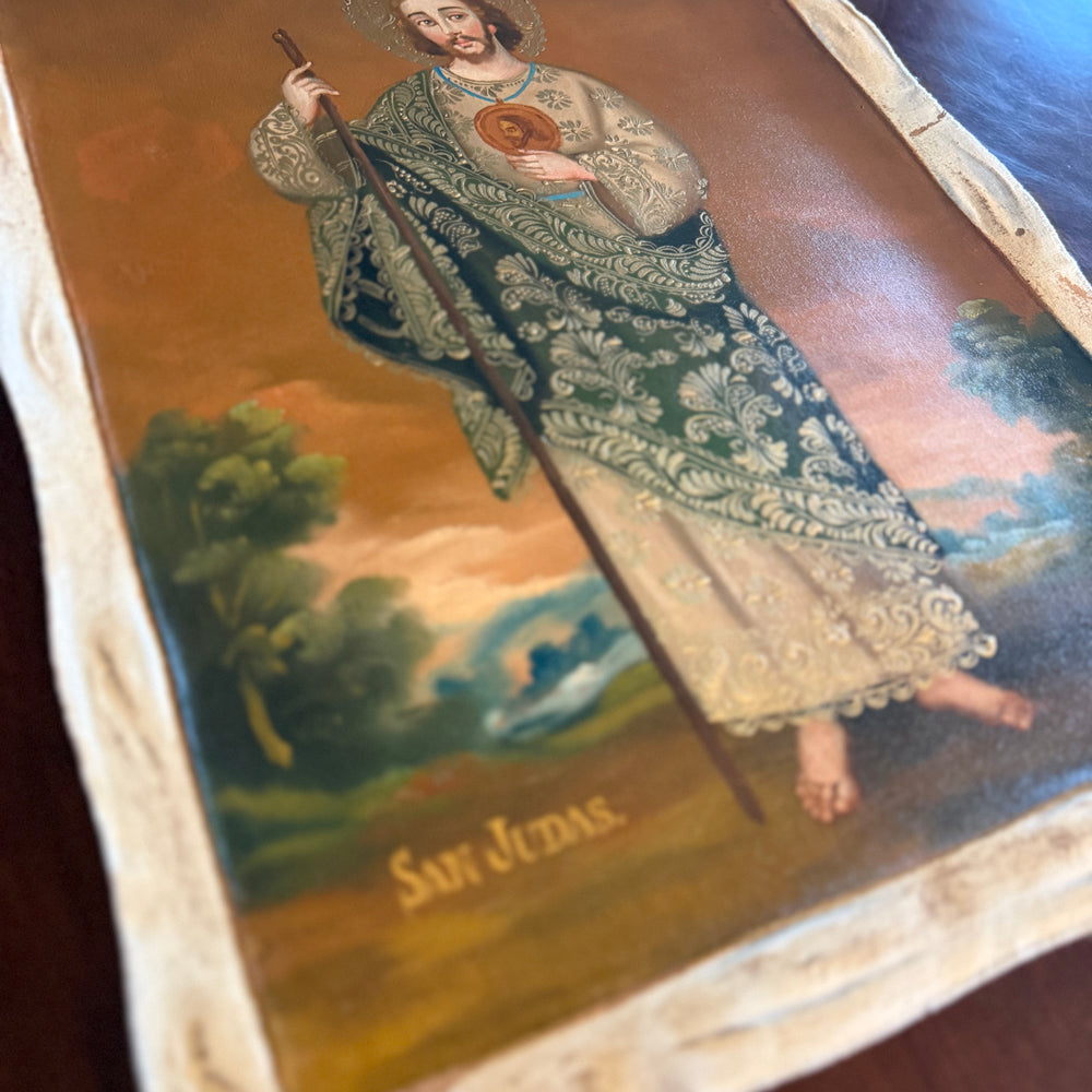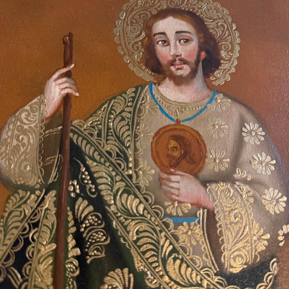 This striking portrait shows Saint Jude holding the image of Christ on his chest — the ancient symbol of the miraculous cure he brought to King Abgar and a sign of Christ’s mercy for those in despair. His green mantle, the color of hope, contrasts beautifully with the warm gold detailing and intricate textures characteristic of Peruvian sacred art.