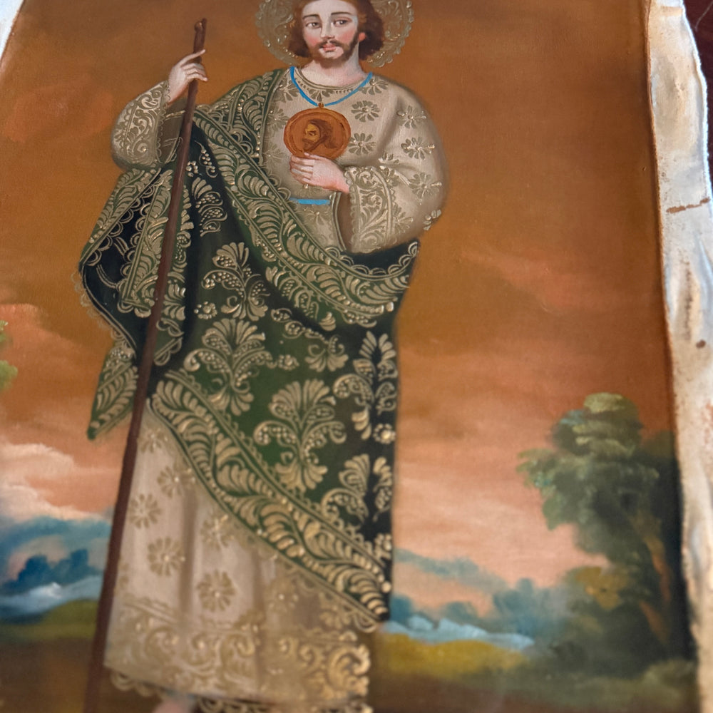Honor the patron saint of impossible causes with this powerful 12×16-inch original hand-painted oil painting of Saint Jude Thaddeus, crafted in the ornate Andean-Baroque tradition of the Cusco School.