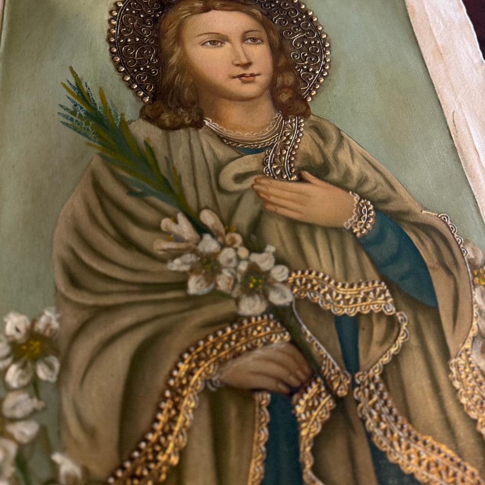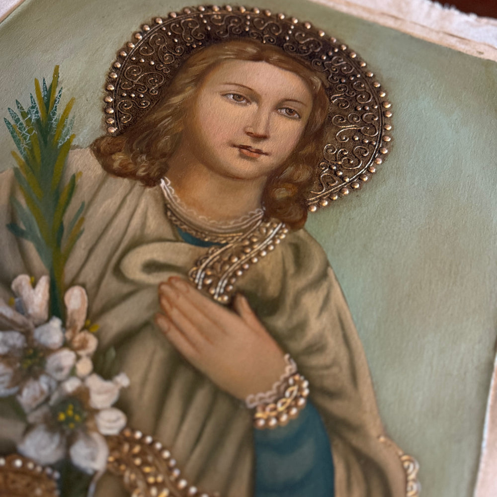 This tender portrait depicts the young martyr holding lilies — the timeless symbol of purity and triumph over sin. Her serene expression and gentle posture reflect the extraordinary holiness she lived, even at just eleven years old. Every detail, from the ornate gold patterns to the soft color palette, captures both innocence and heavenly strength.