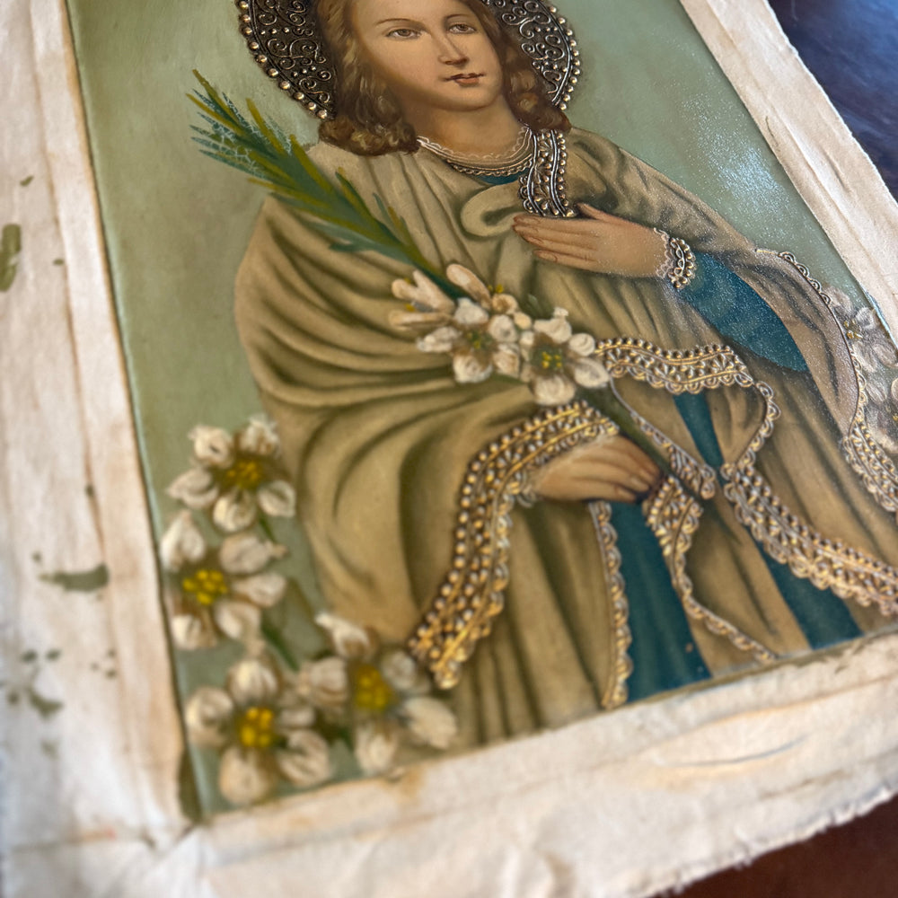 Honor the purity, courage, and heroic forgiveness of Saint Maria Goretti with this beautiful 12×16-inch original hand-painted oil painting, created in the rich Andean-Baroque tradition of the Cusco School.
