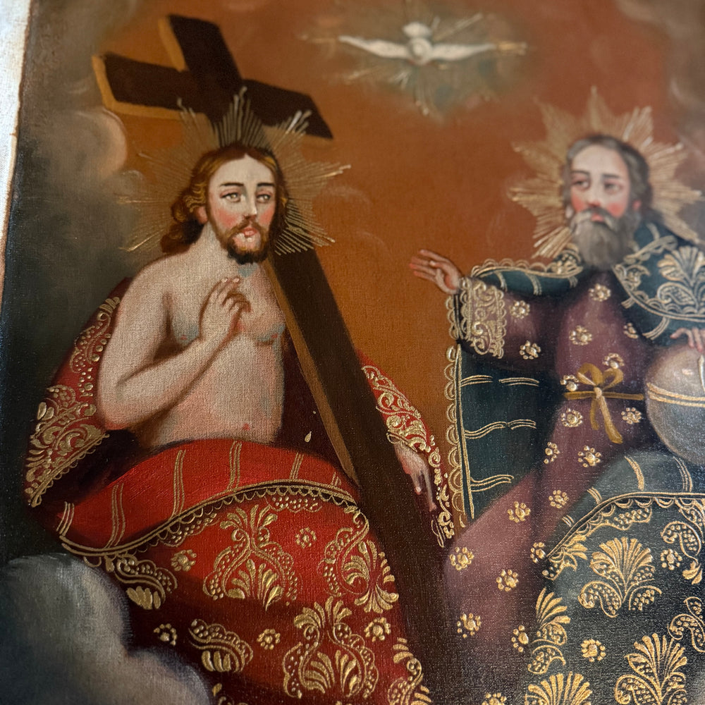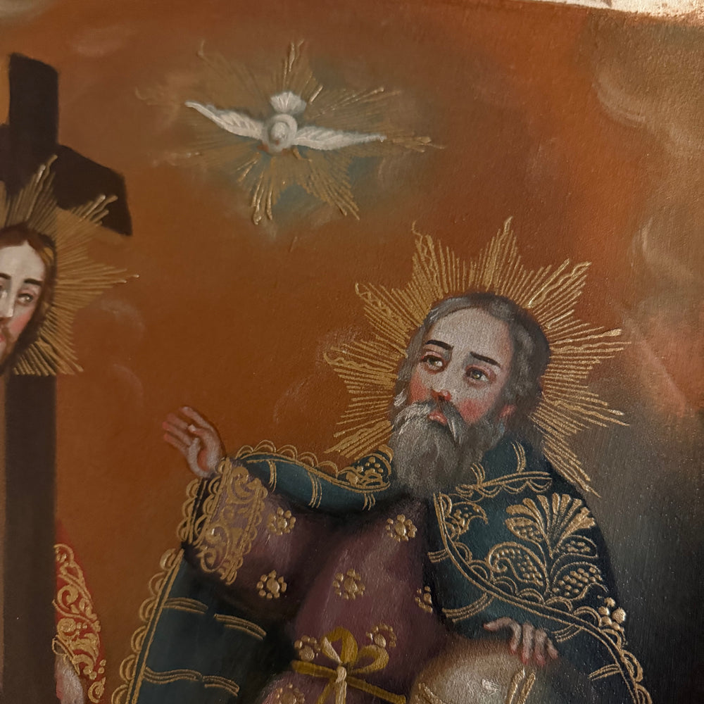 This exquisite composition portrays the Father, the Son, and the Holy Ghost in perfect harmony. God the Father, enthroned in celestial splendor; Christ the Son, clothed in royal red and offering His blessing; and the Holy Spirit descending as a luminous dove—all rendered with intricate gold detailing and vibrant colors native to the Peruvian highlands.