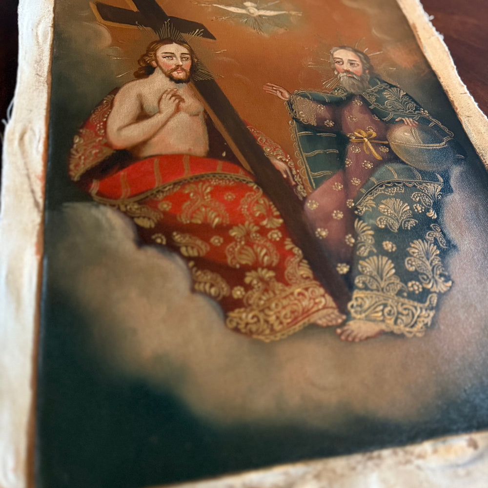 The Holy Trinity — Father, Son, and Holy Ghost — 12×16” Original Hand-Painted Oil Painting (Cusco School Style)