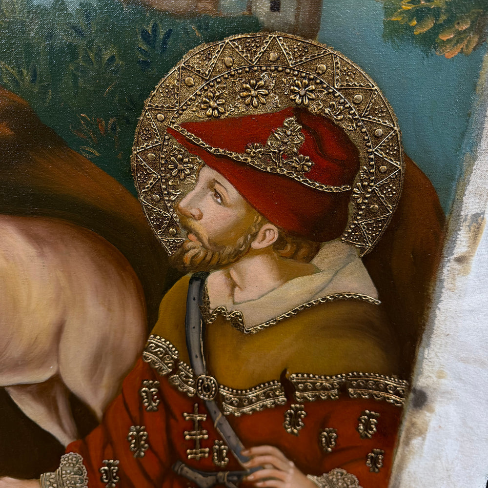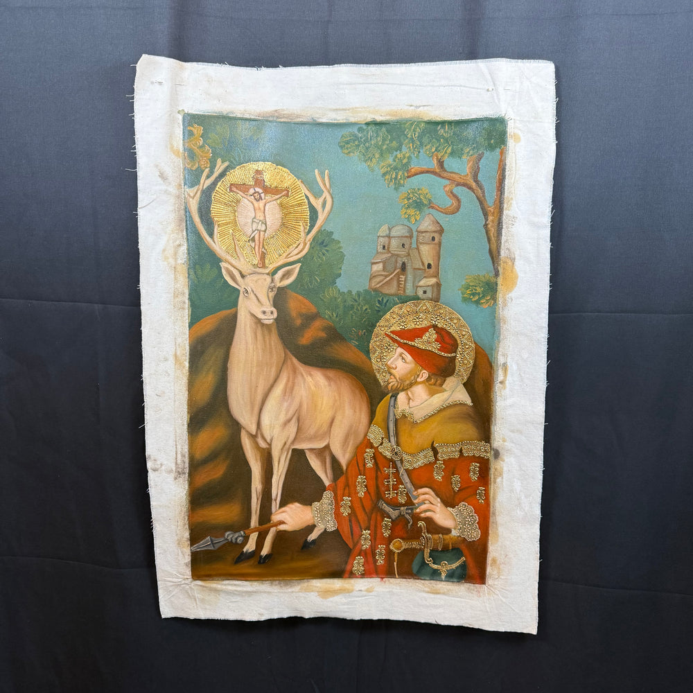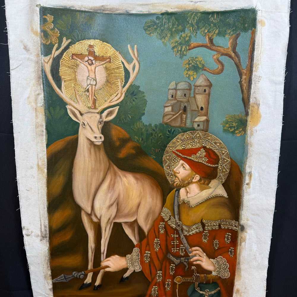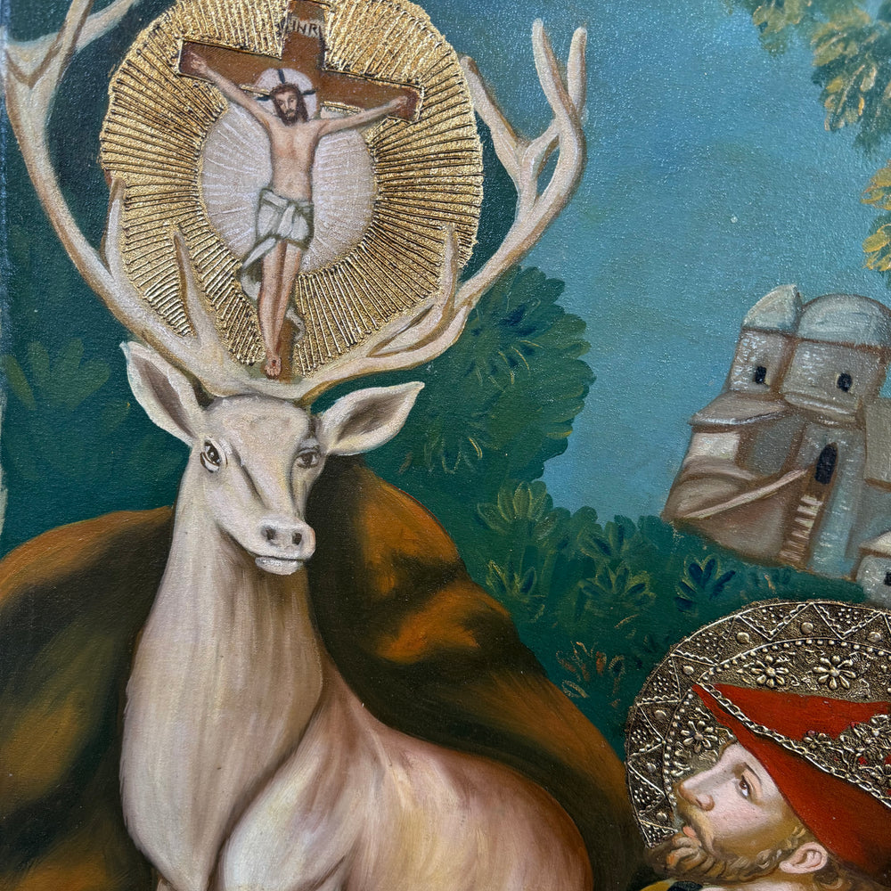 While in the woods, St. Hubert came upon a male deer with large antlers, looking right at him. As St. Hubert readied his bow and arrow to take the deer down, he noticed between the deer’s antlers was a crucifix, radiant with light. St. Hubert heard a voice telling him to turn his life over to God. He got down from his horse, knelt on the ground, and promised that he would follow the Lord’s command.