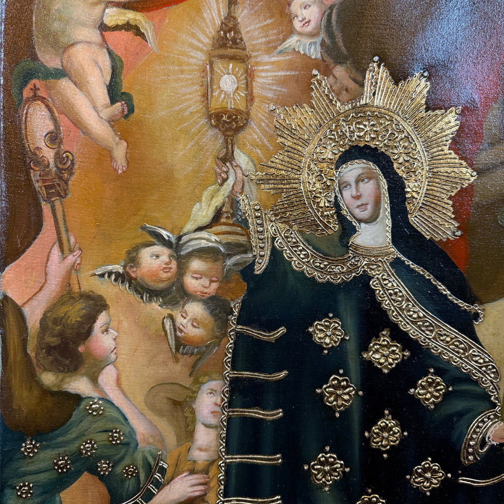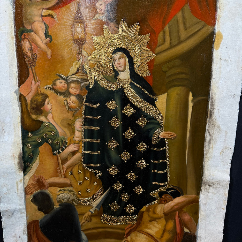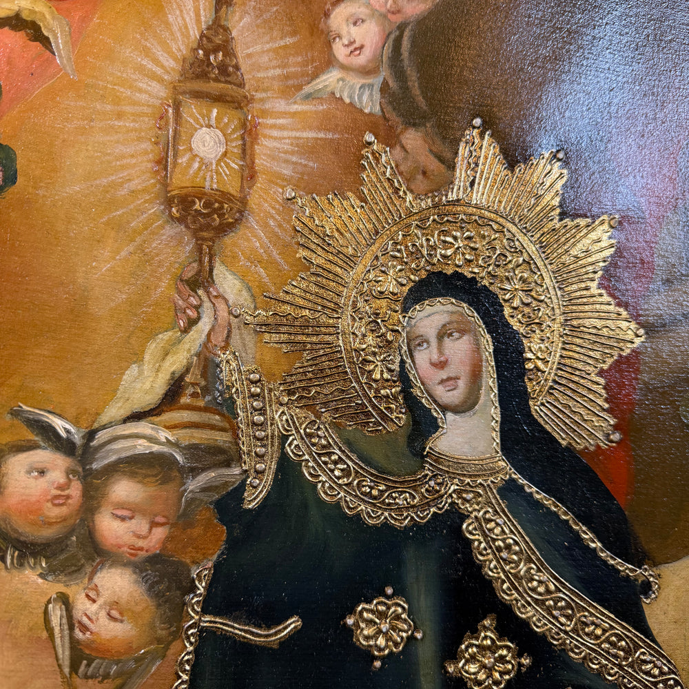 This painting of St. Clare of Assisi tells the story of the famous miracle that occurred in 1240 in which the Saracen soldiers stormed the convent cloister of San Damiano in Assisi where St. Clare and her sisters lived. The miracle story is taken from the writings of Tommaso da Celano; a Francisican Friar who lived during the time of St. Clare.