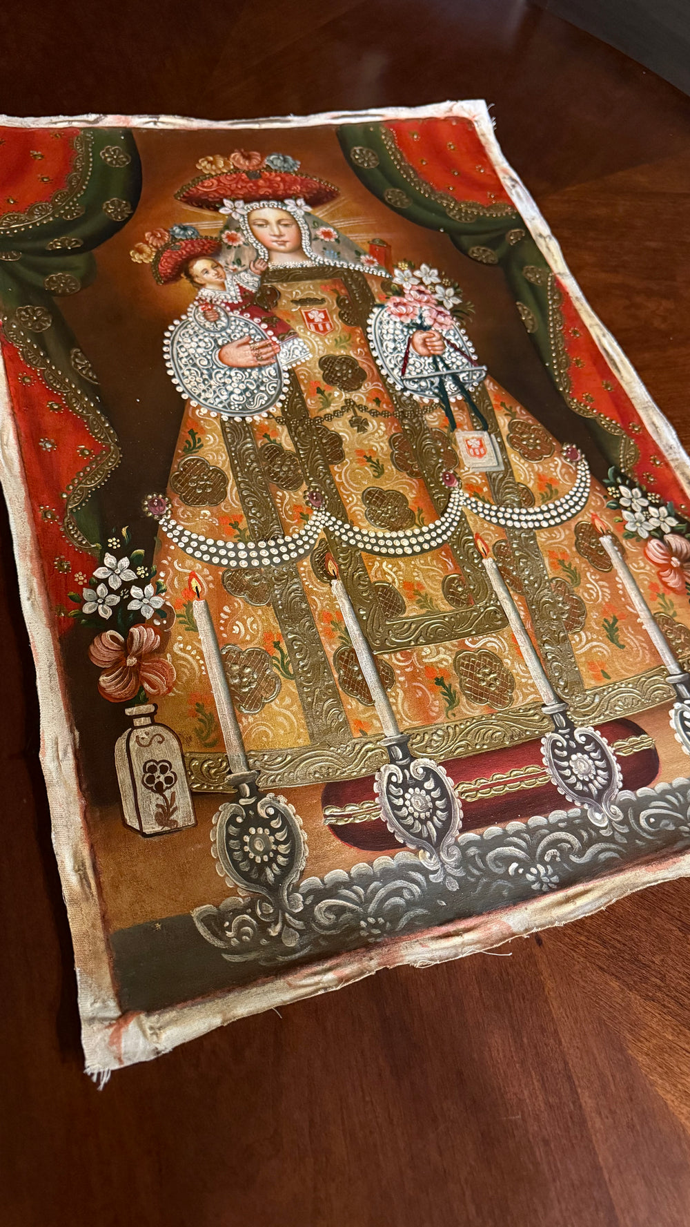 Honor the tender love and serene majesty of the Blessed Virgin with this 16×24-inch original hand-painted oil painting of Our Lady of Bethlehem, created in the richly adorned Cusco School (Peruvian sacred art) tradition.