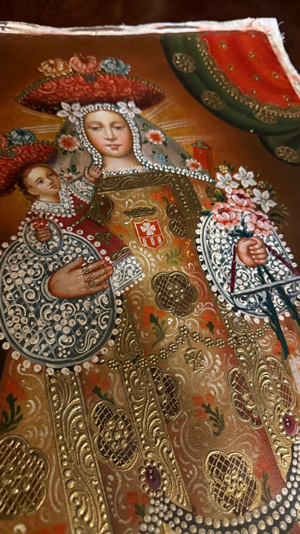 The Peruvian artist’s craftsmanship shines through the ornate patterns, the delicate filigree-like gold detailing, and the harmonious color palette. The composition radiates peace, reverence, and traditional Cusqueño elegance—making it a profound devotional piece for any Catholic home.