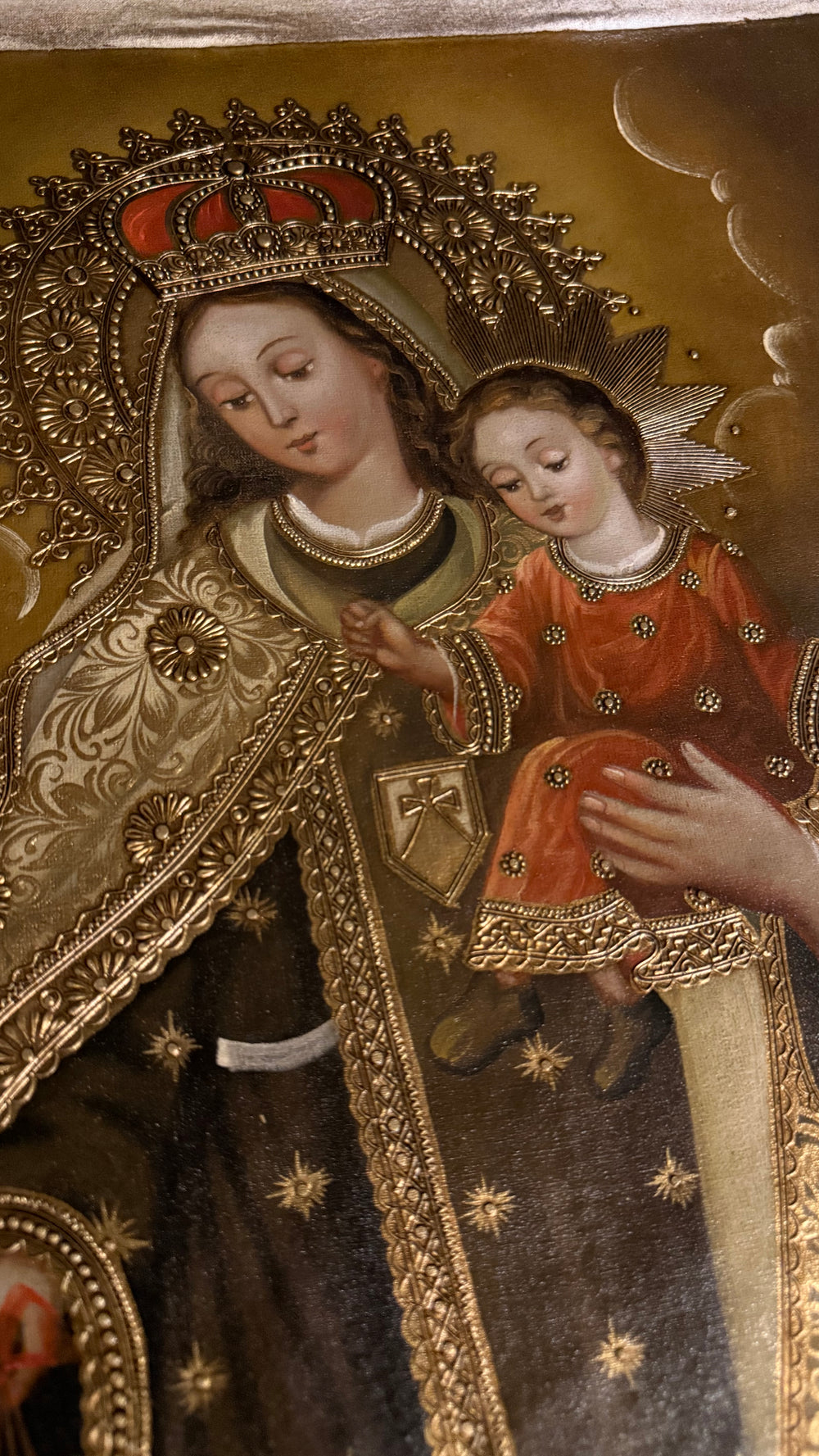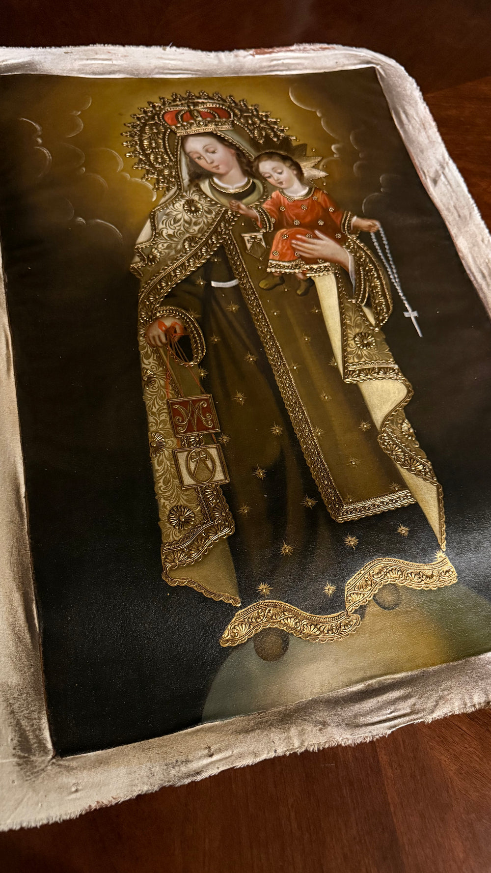 This striking artwork depicts the Blessed Virgin Mary clothed in richly embroidered garments, holding the Child Jesus close while presenting the sacred Brown Scapular, the symbol of her maternal protection and promise of salvation. The Peruvian artist’s craftsmanship is evident in the ornate gold detailing, expressive faces, and vibrant colors that reflect the depth of Marian devotion.