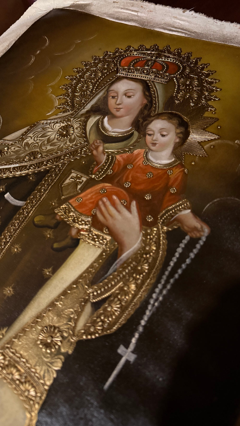This exquisite artwork depicts the Blessed Virgin Mary holding the Child Jesus, both adorned with the unmistakable elegance of Cusco School gold-leaf detailing. Mary appears as the Queen and Mother of Carmel—dressed in richly embroidered garments, crowned, and holding the Brown Scapular, symbol of her promise of spiritual protection and grace. The gentle expression of both Mother and Child invites prayer, peace, and trust in Mary’s maternal care.
