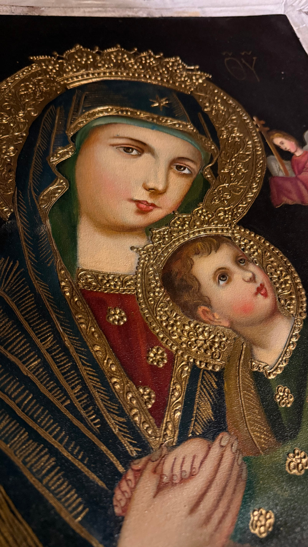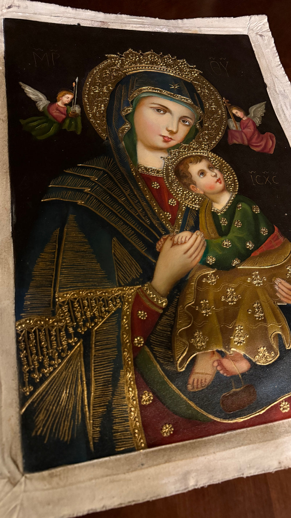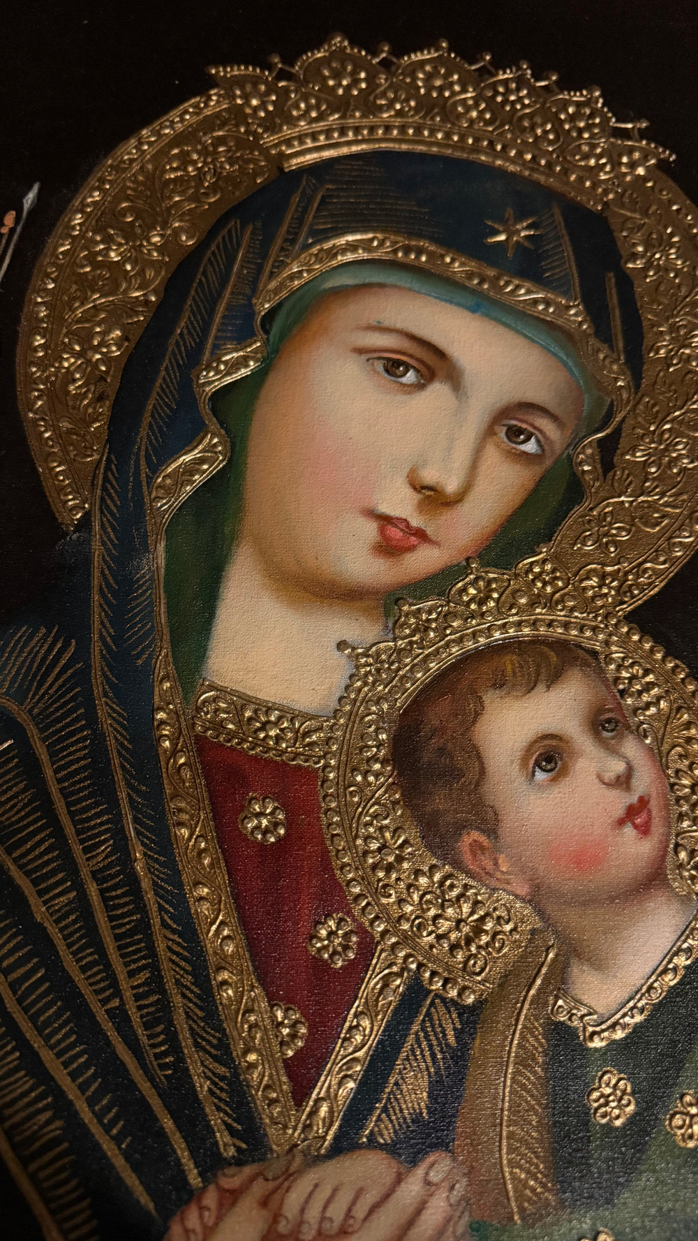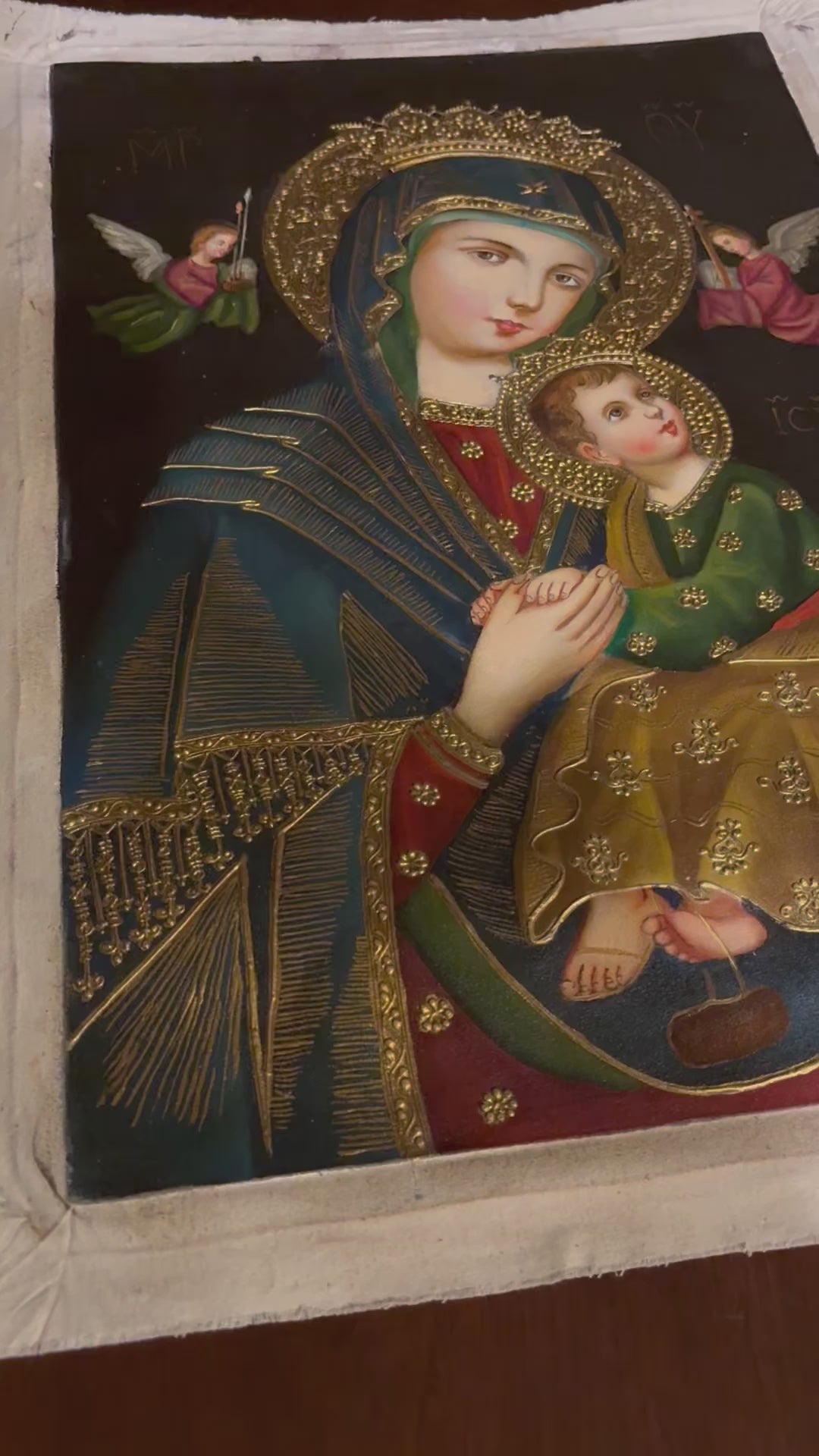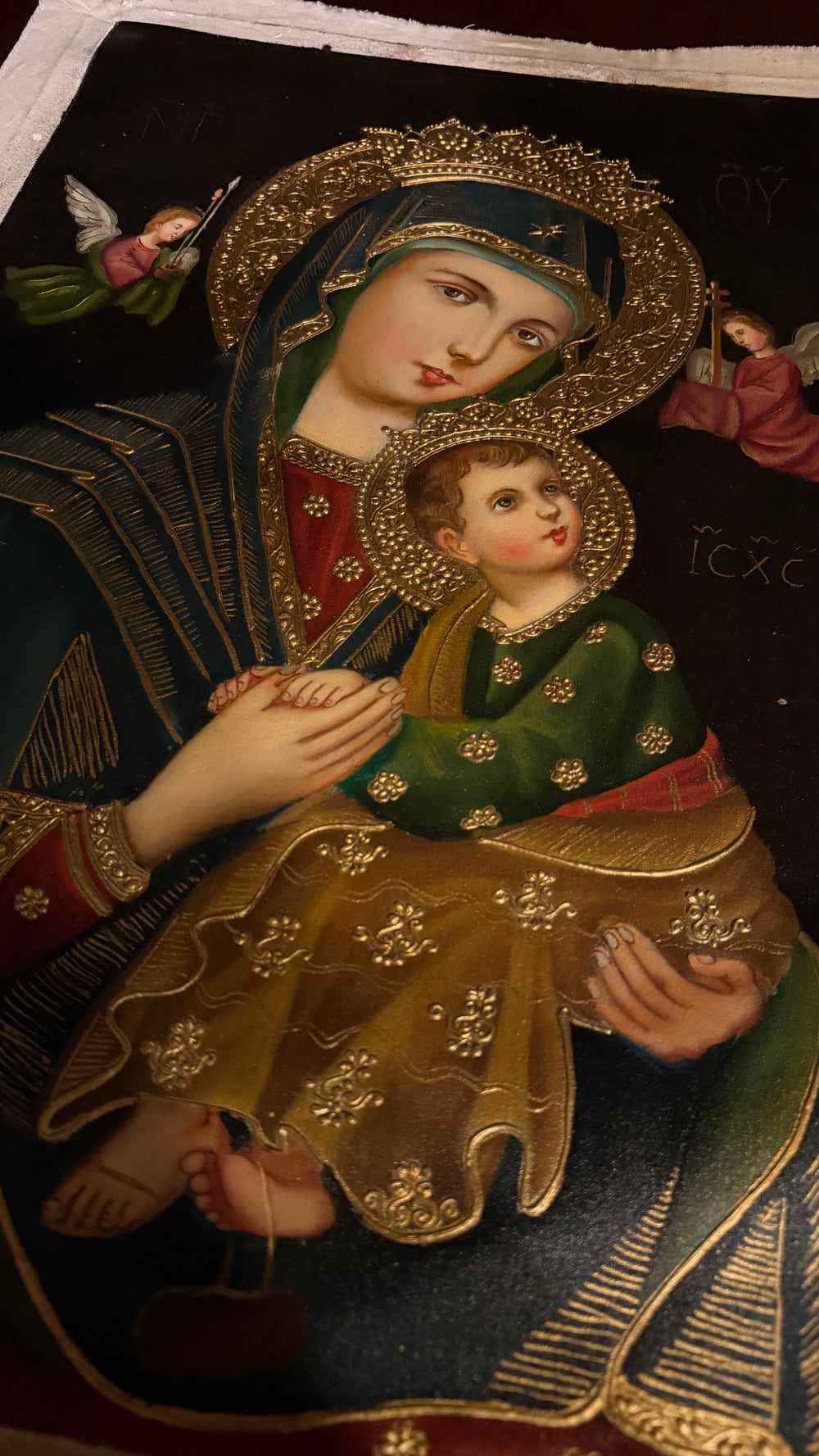 Invite the powerful maternal protection of the Blessed Virgin Mary into your home with this 16×24-inch original hand-painted oil painting of Our Lady of Perpetual Help, created in the traditional Cusco School (Peruvian sacred art) style.