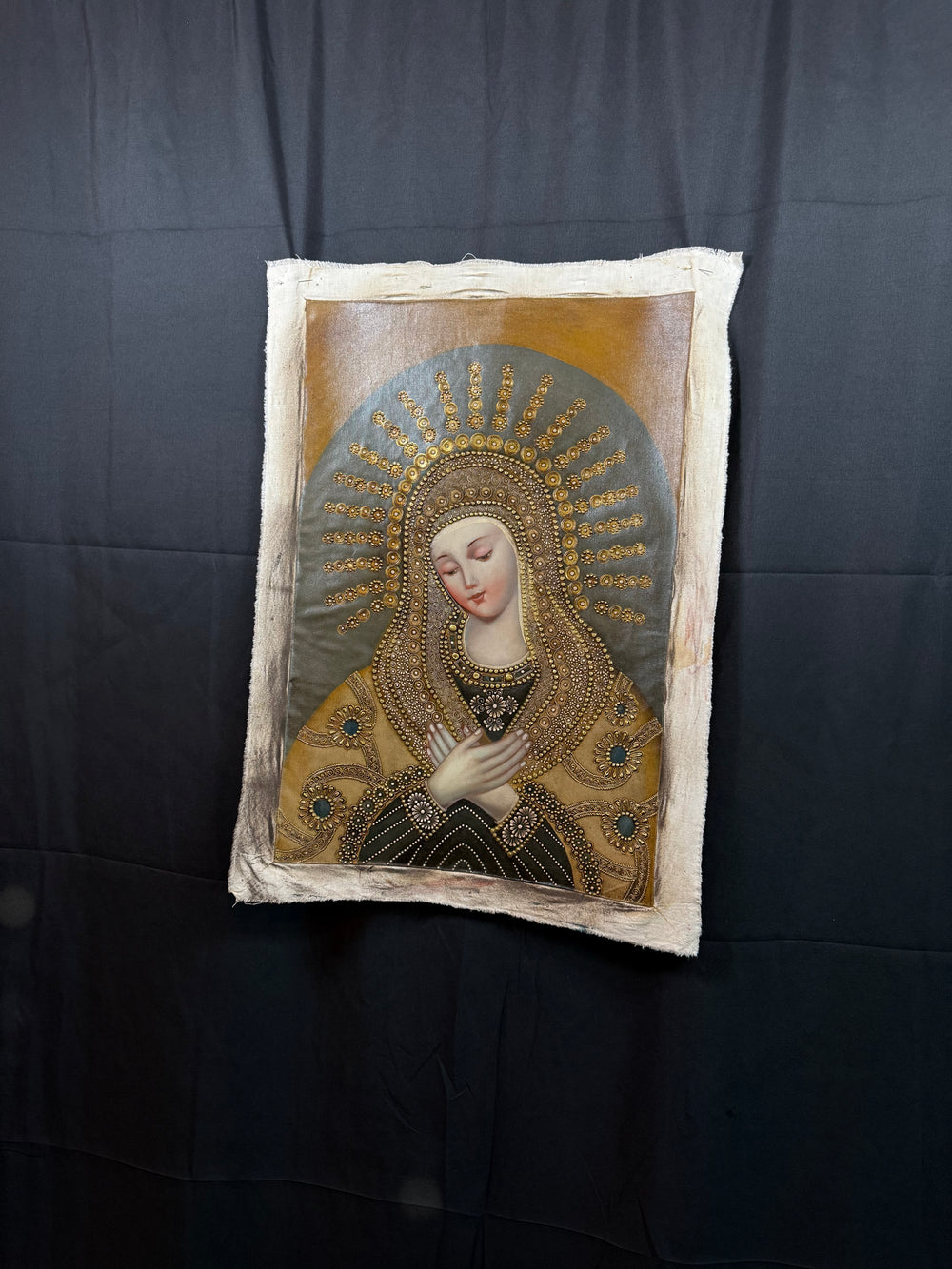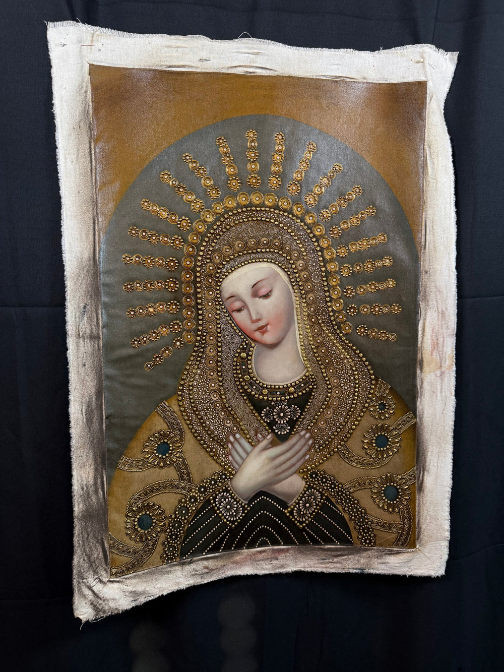 • Intricate gold filigree halos and embroidery, characteristic of Cusco-influenced craftsmanship