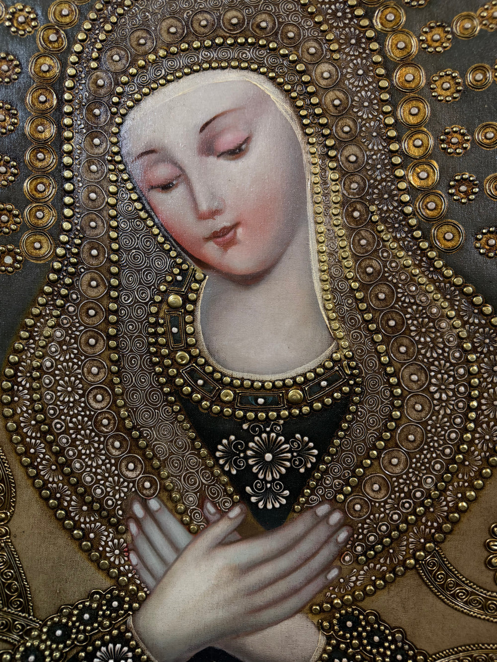 Her sorrowful yet peaceful face reminds the faithful of her steadfast courage, compassion, and maternal intercession in the midst of suffering.