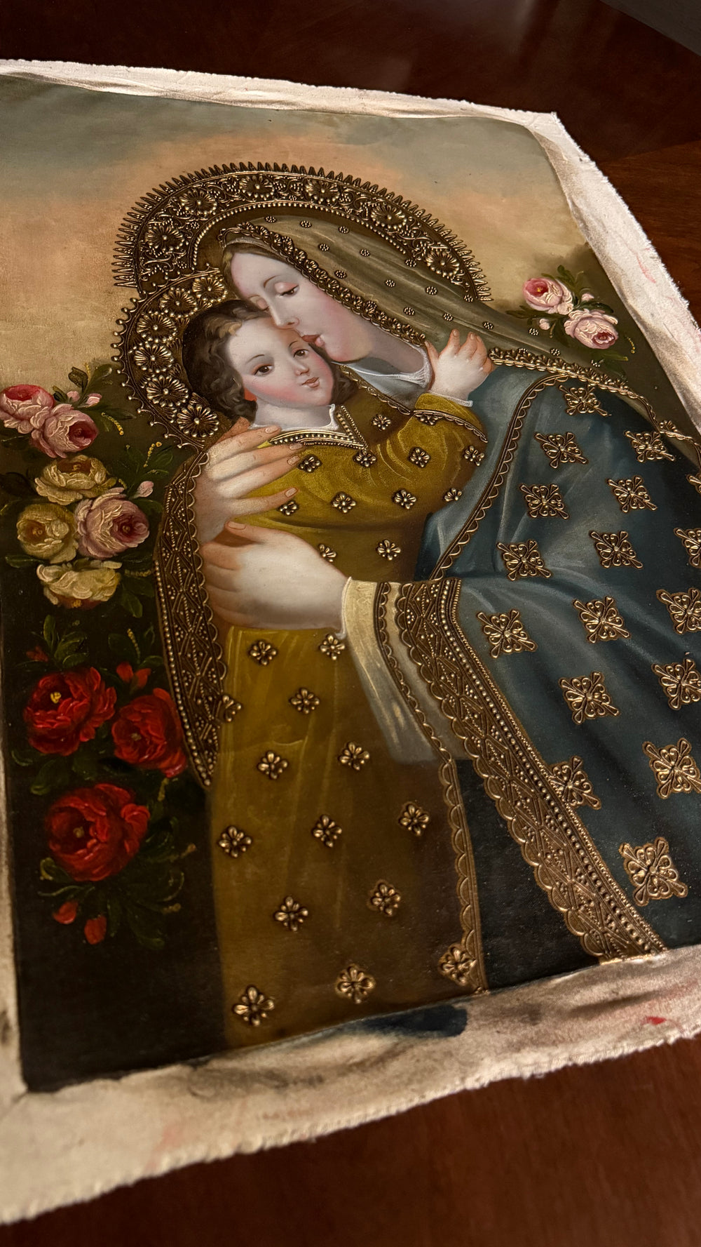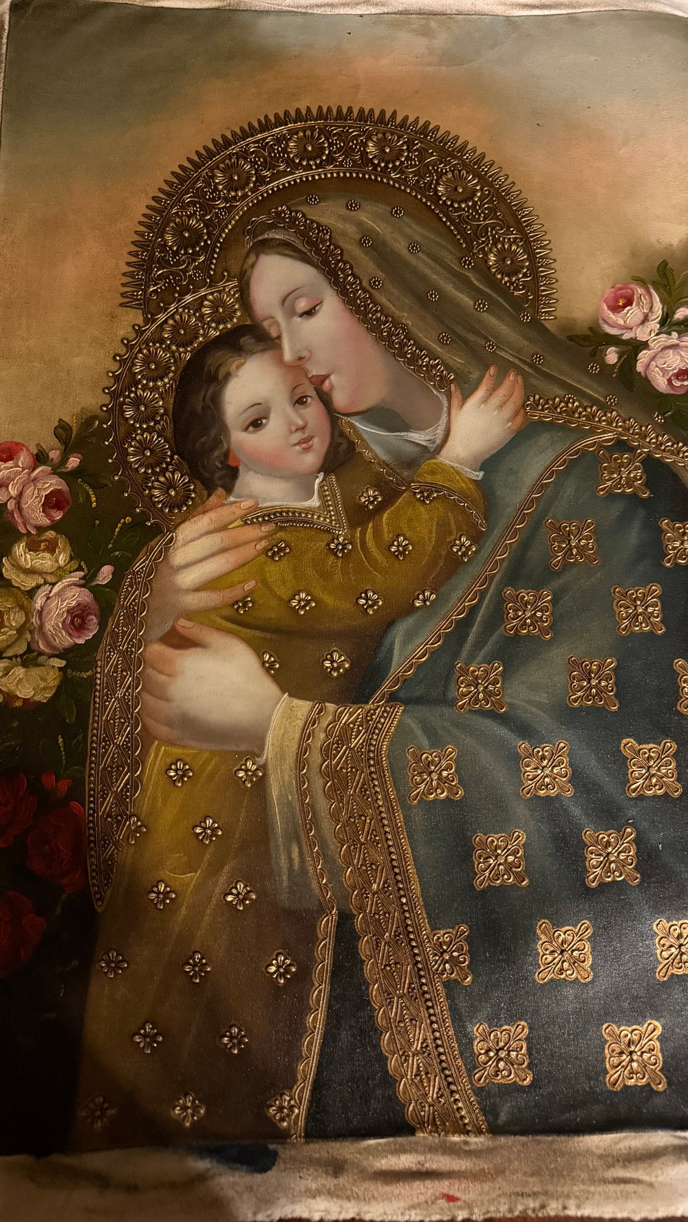 Embrace the gentle beauty and profound intimacy of Our Lady of Tenderness with this 16×24-inch original hand-painted oil painting, created in the revered Cusco School (Peruvian Andean-Baroque) tradition.