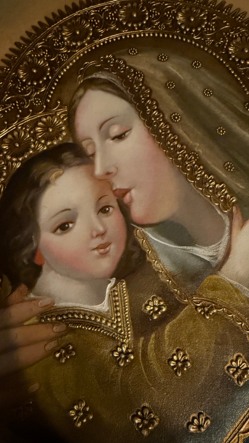 The tender embrace of Mary and Jesus invites peace, warmth, and spiritual comfort into your home, making this piece ideal for prayer spaces, Marian devotion, or as a meaningful Catholic gift.