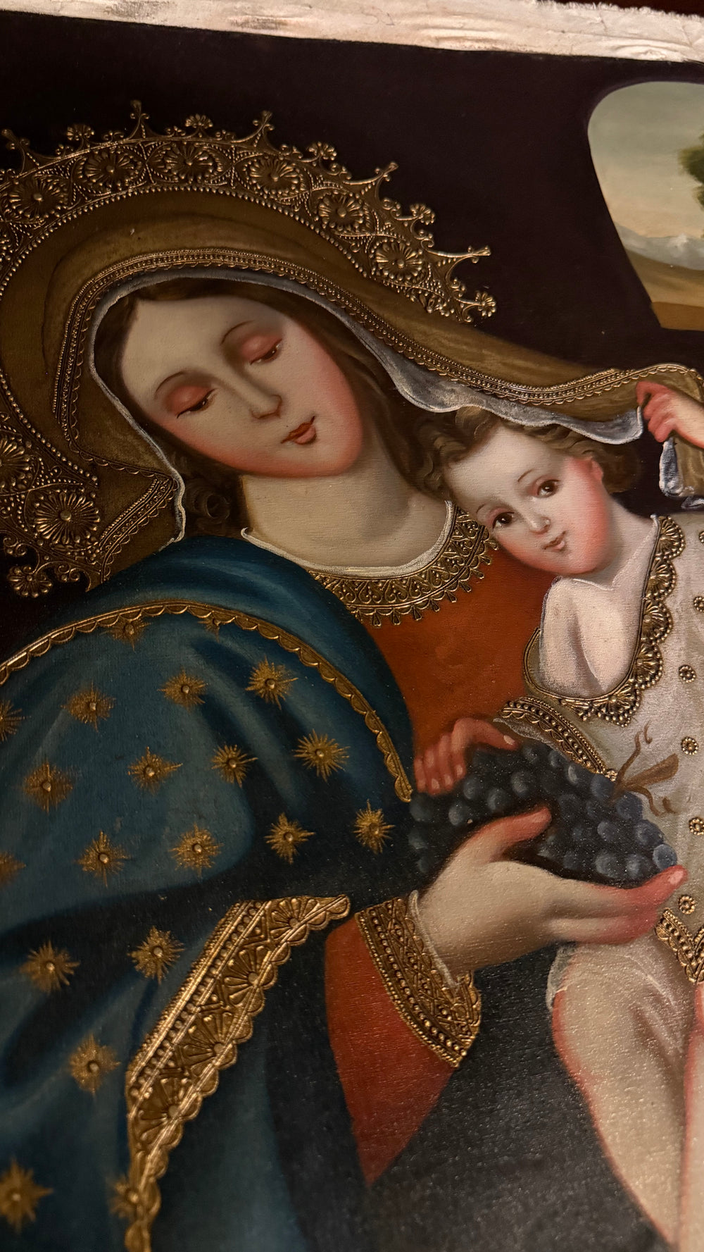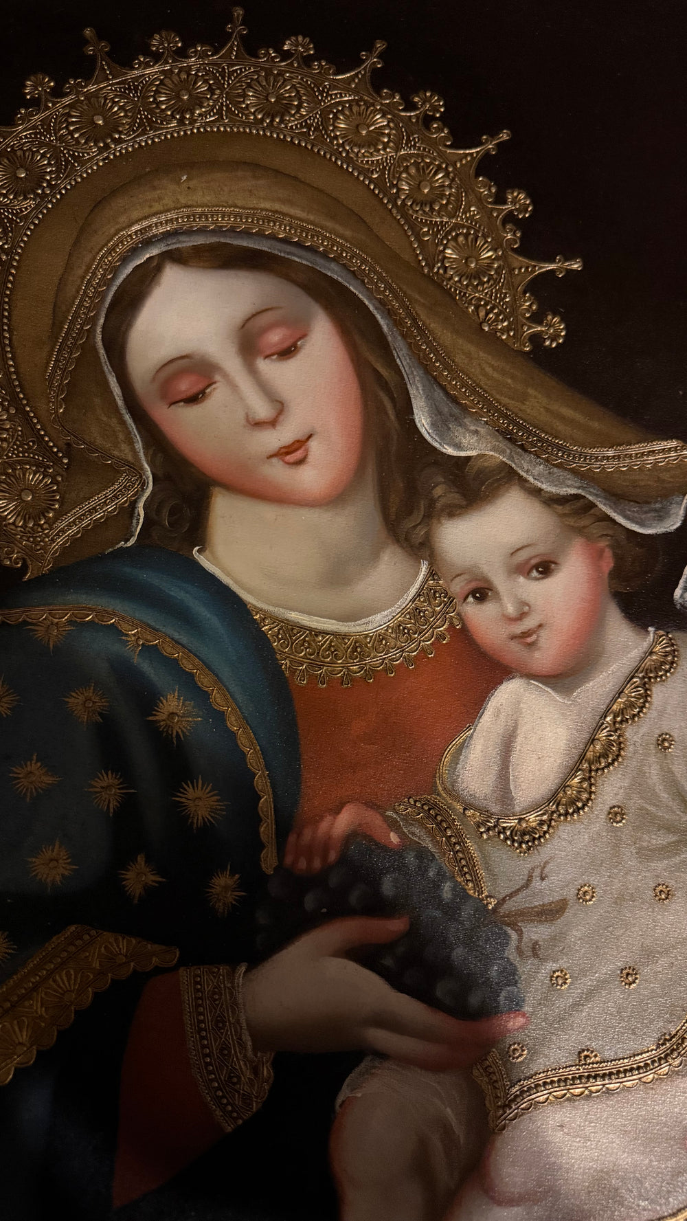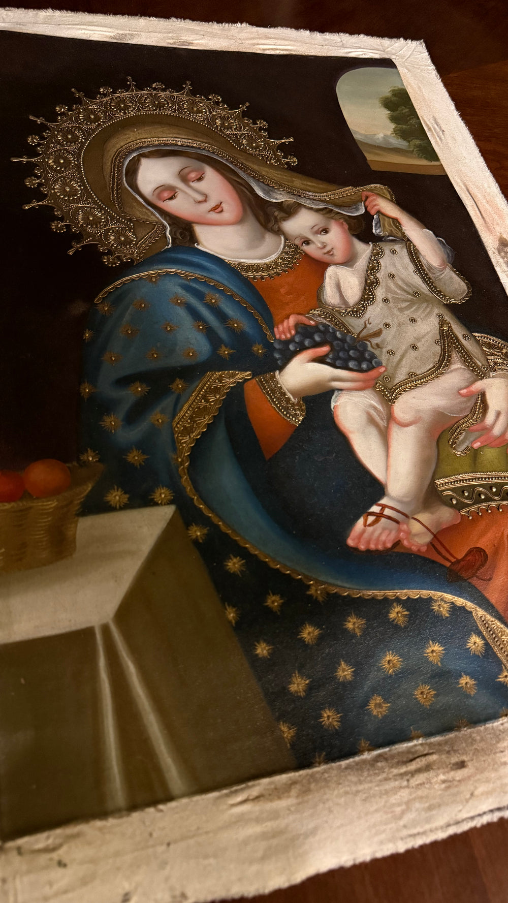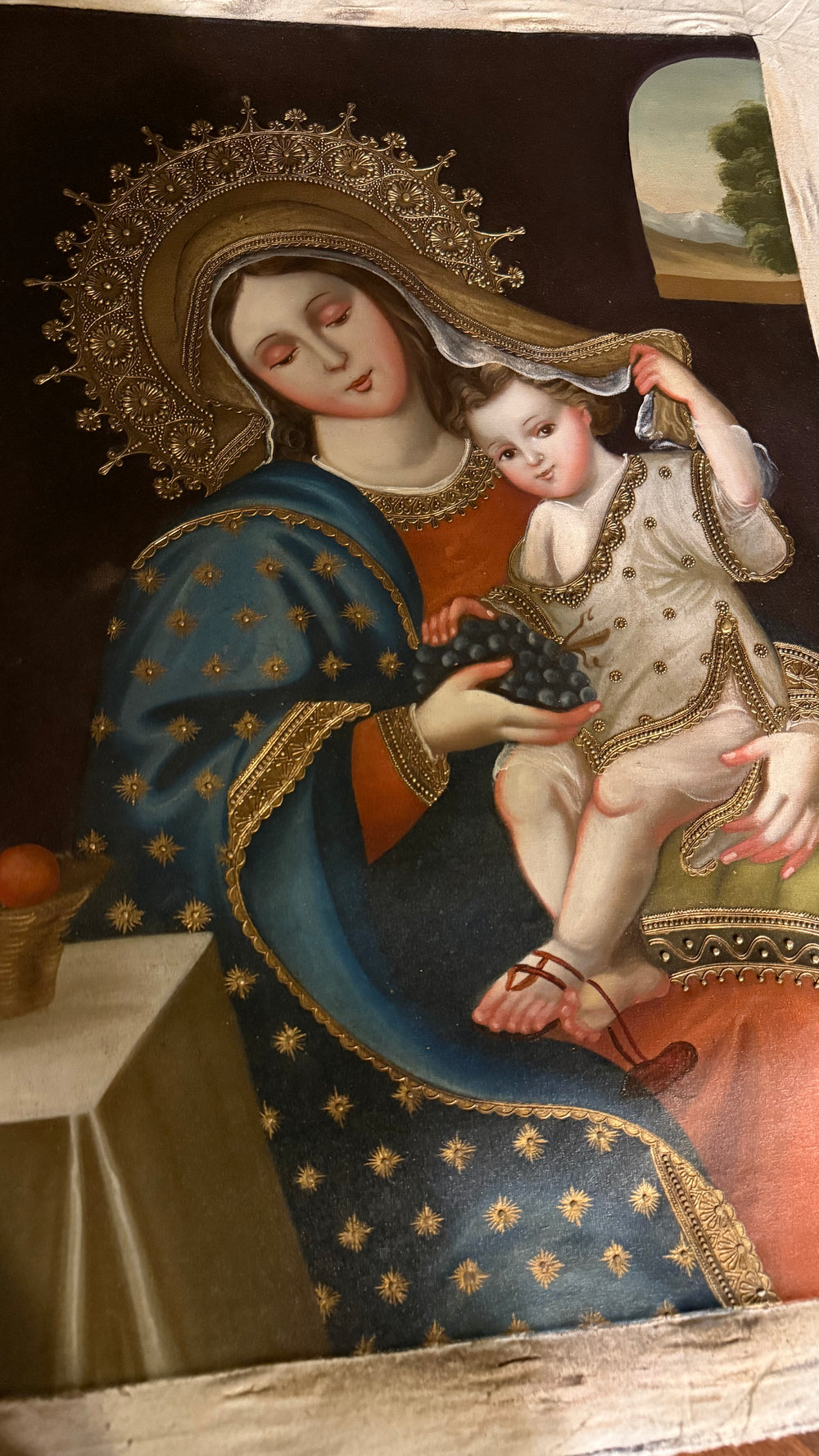Our Lady of the Grapes — 16×24” Original Hand-Painted Oil Painting (Cusco School Style)