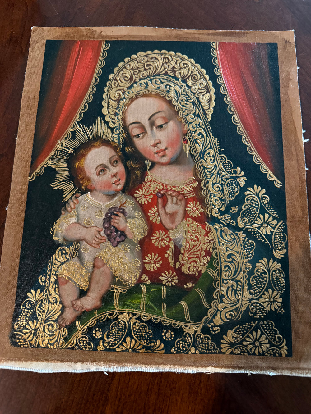 Honor the tender intimacy and Eucharistic symbolism of the Blessed Virgin and Child with this 8×10-inch original hand-painted oil painting, created in the renowned Cusco School (Peruvian Andean-Baroque) tradition.
