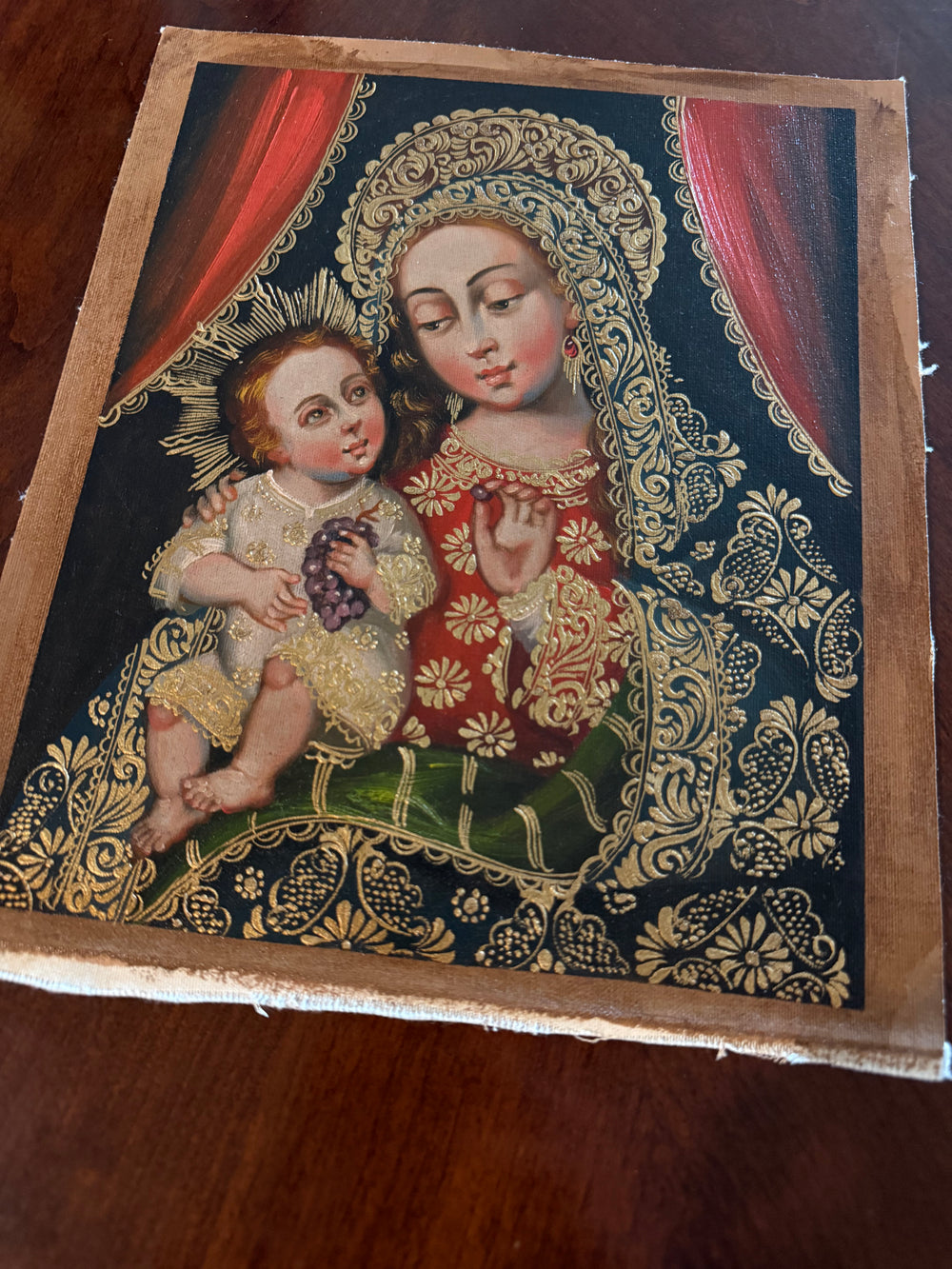 Our Lady with Jesus and Grapes — 8×10” Original Hand-Painted Oil Painting (Cusco School Style)